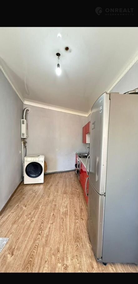 Кухня с современной техникой: холодильник, стиральная машина, газовая плита