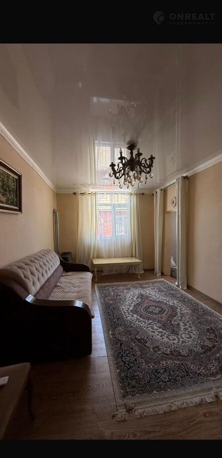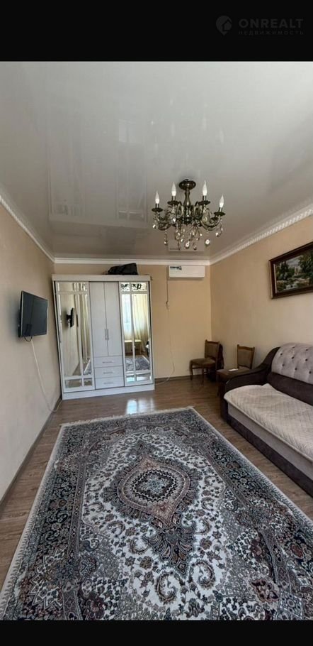 Гостиная с красивым ковром, мебелью, кондиционером и люстрой