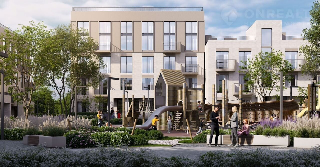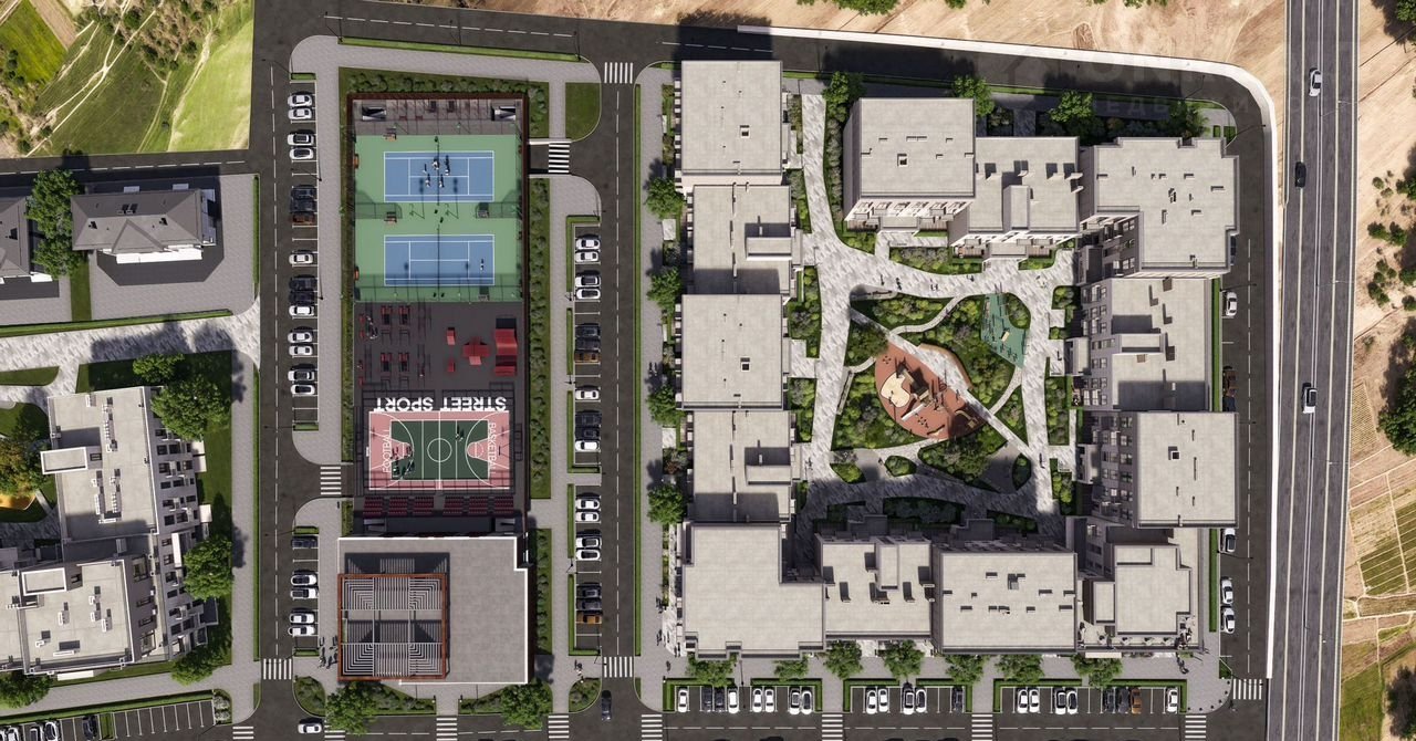 - Прoсторные дворы без машин – только 21% территории застроено, остальное – зелёные зоны, паркинг, прогулочные аллеи.