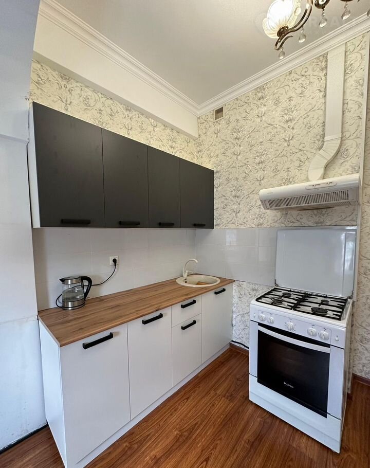 Кухня: новая мебель, столешница под дерево, верхние и нижние шкафы, газовая плита с духовкой, вытяжка, мойка.