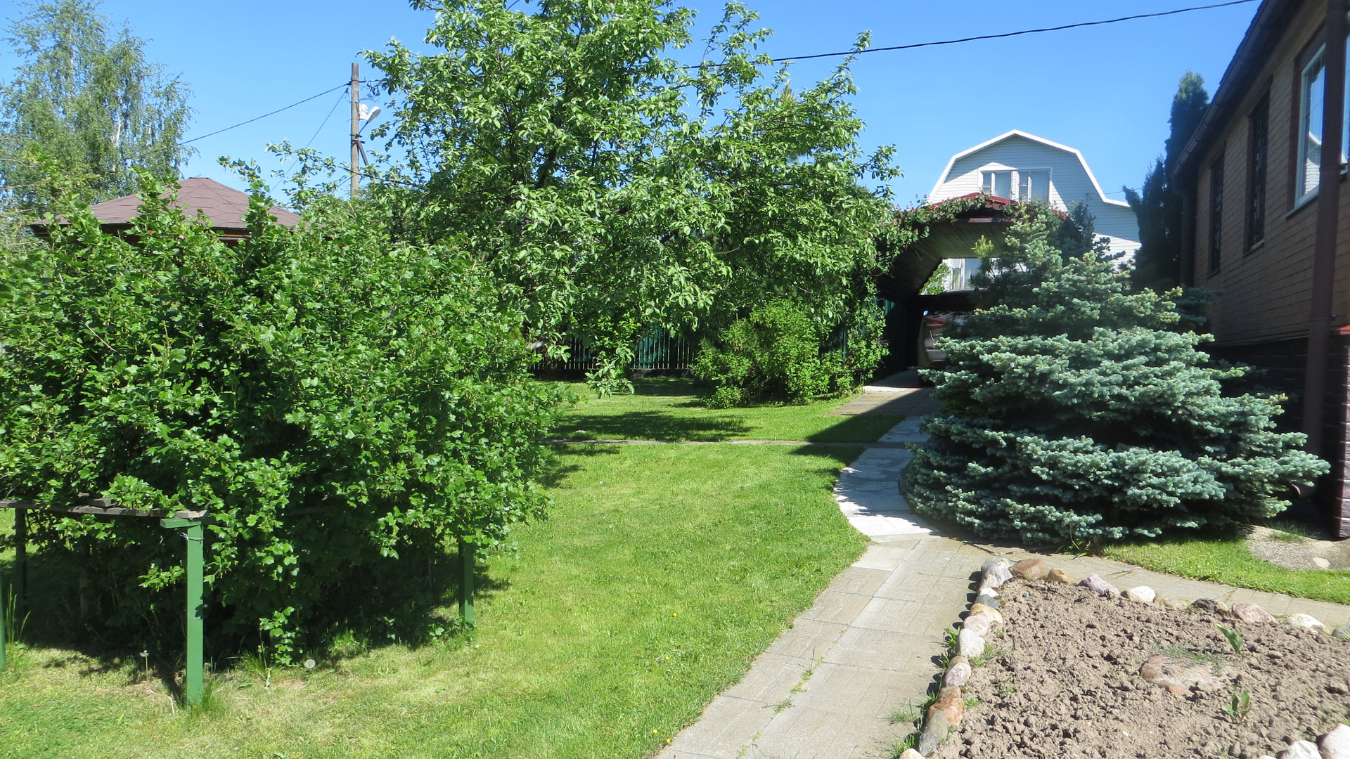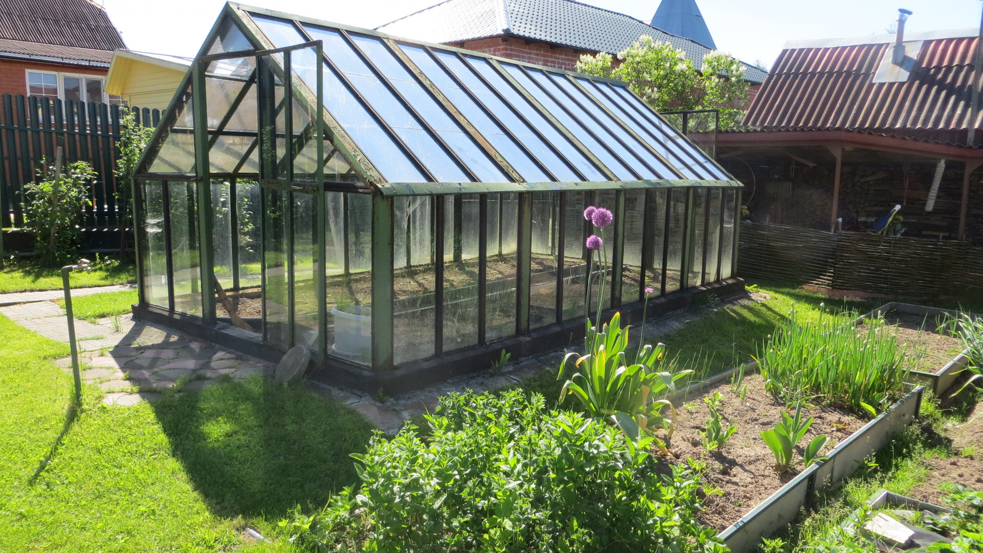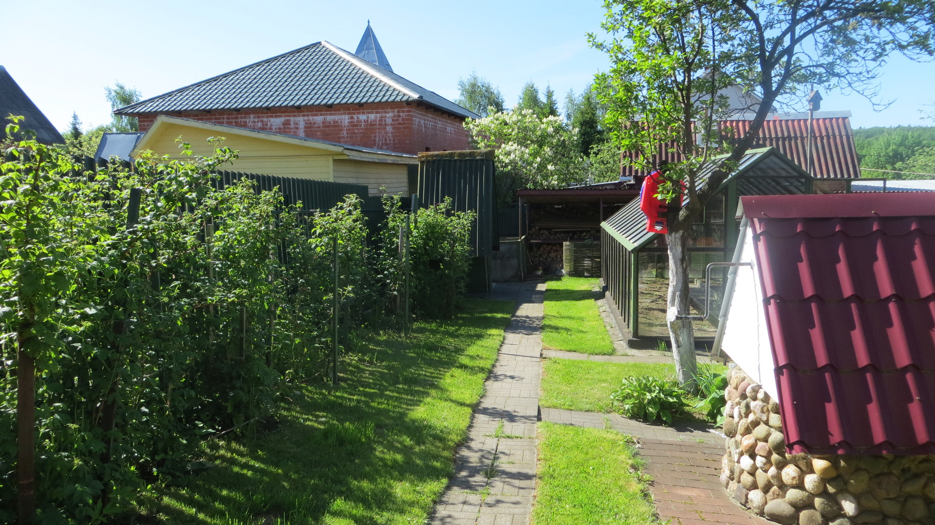 Ухоженный участок с зоной грядок: стеклянной теплицей и навесом с дровами, клубника, малина, кустарники, подовые деревья.