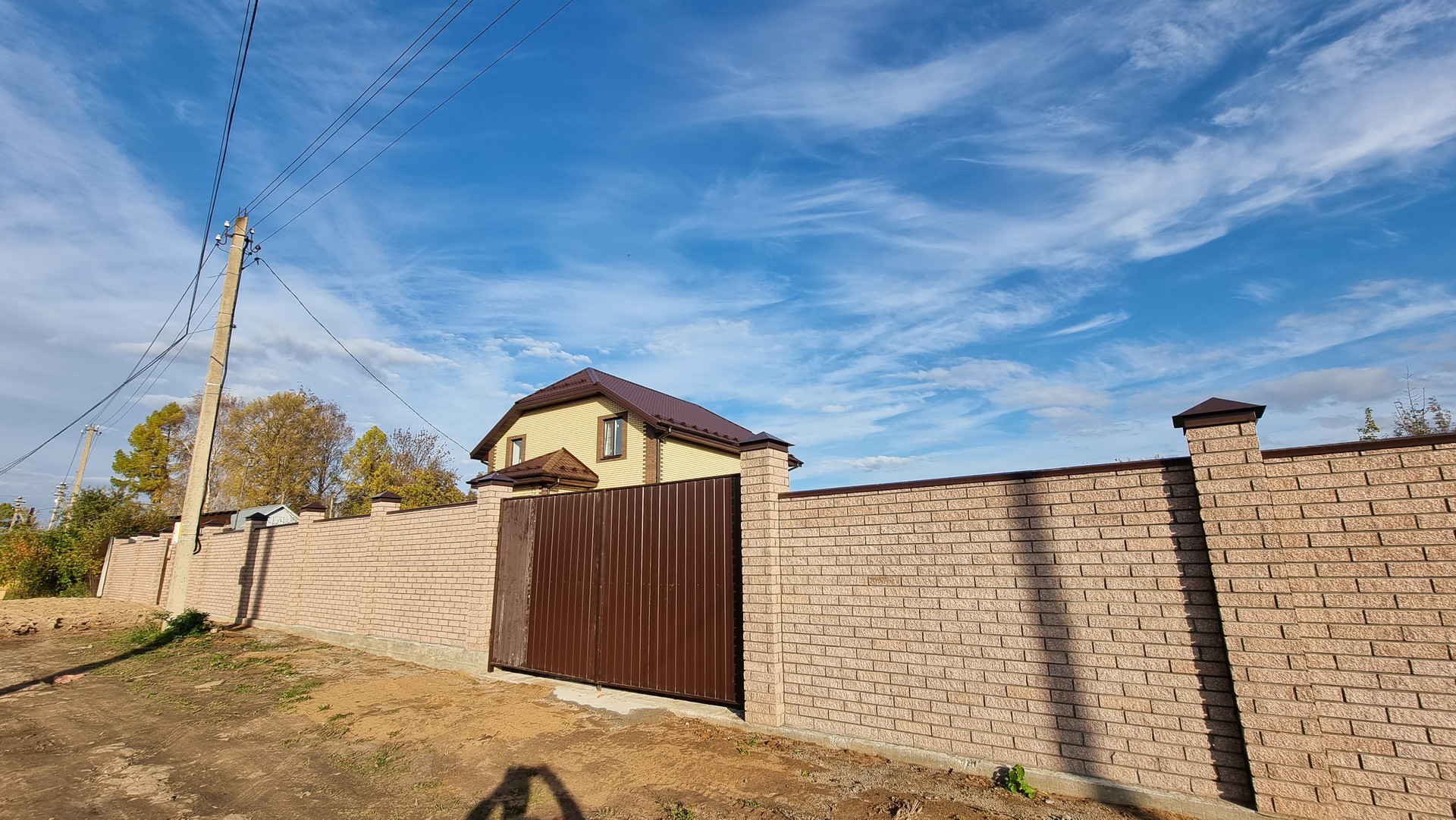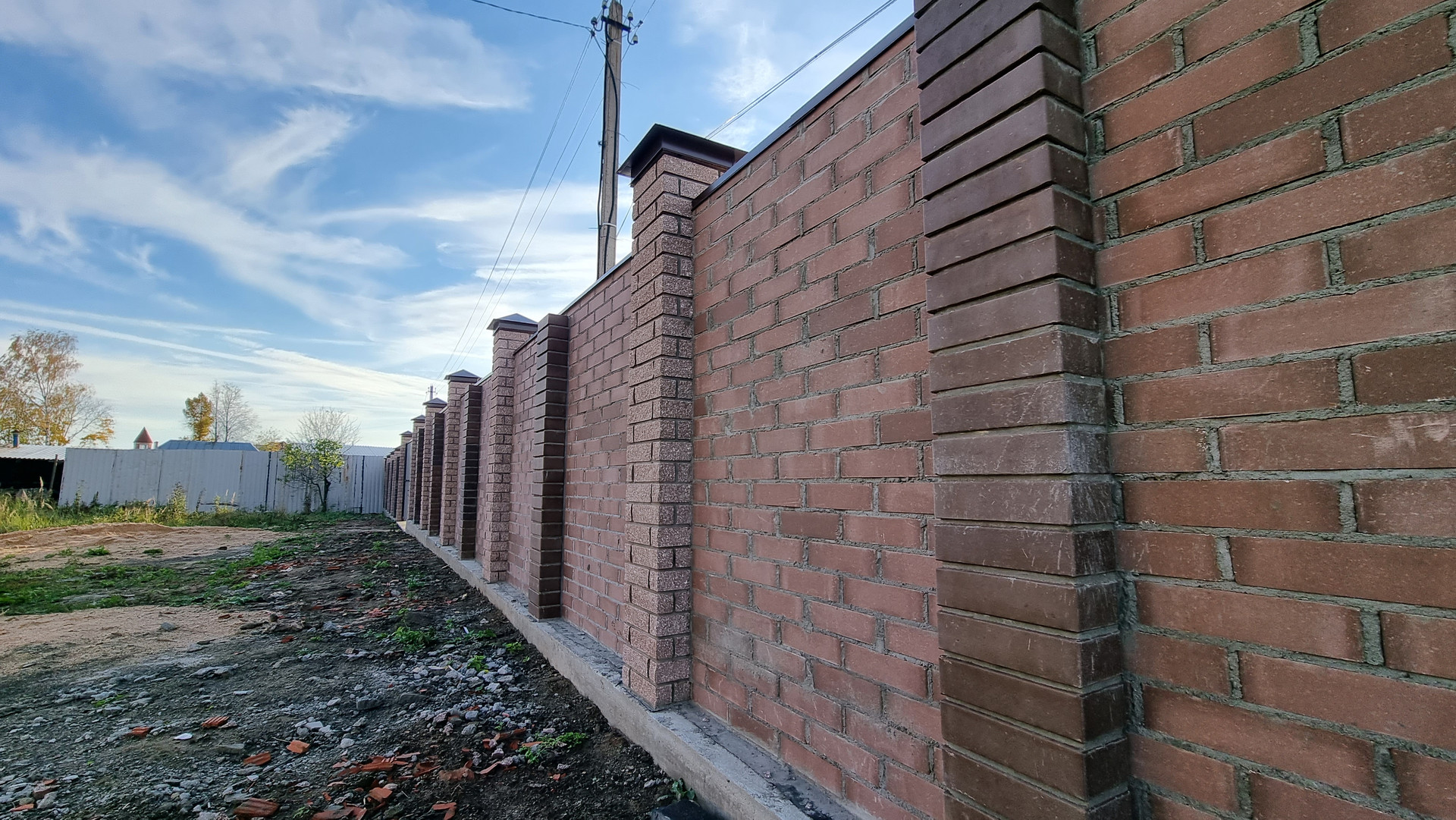 выровненный, правильной формы, по фасаду кирпичный забор с установленными распашными