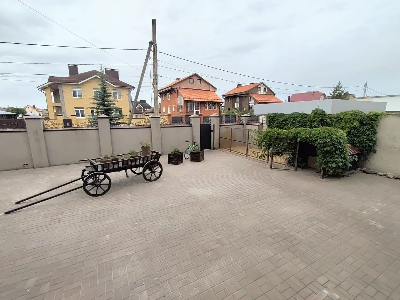Территория огорожена высоким забором.