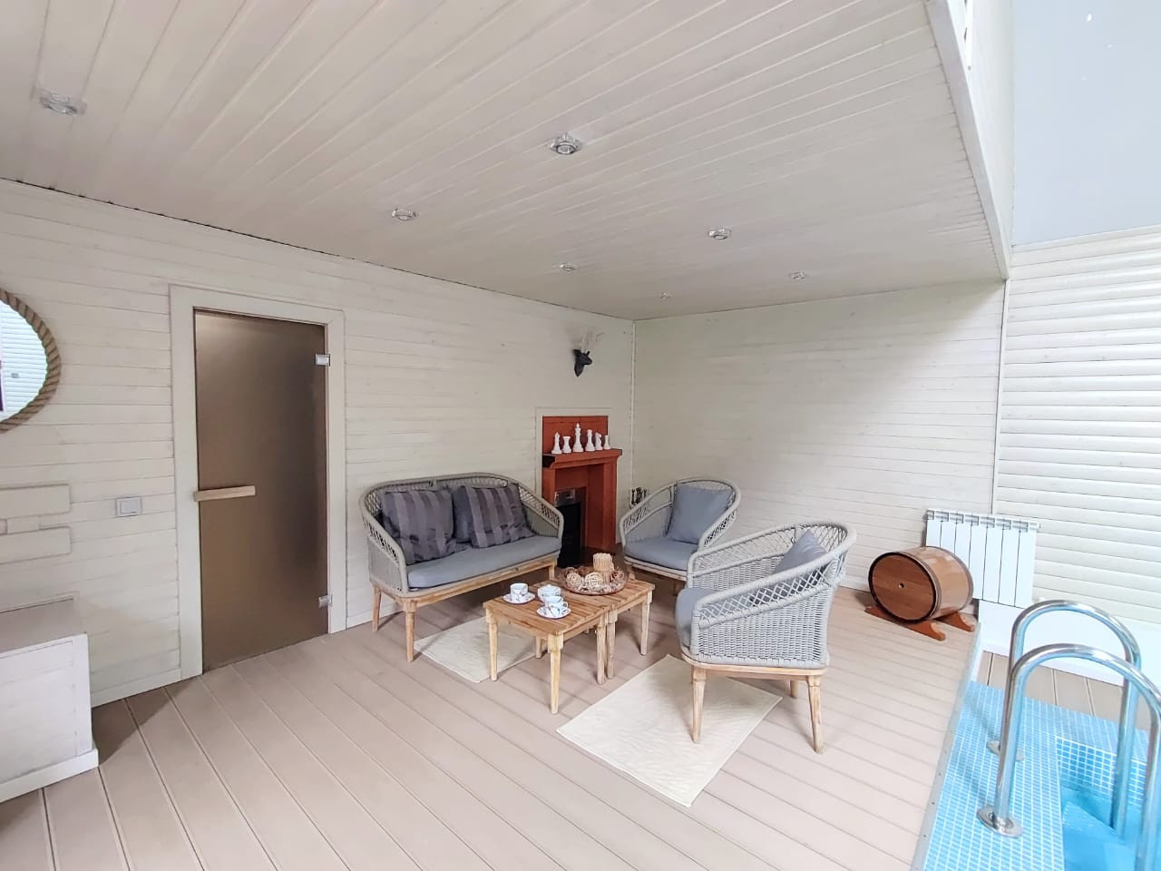 Сауна с бассейном 50 м2, бассейн: глубина 2,2 м, ширина 3 м, длина 4 м.