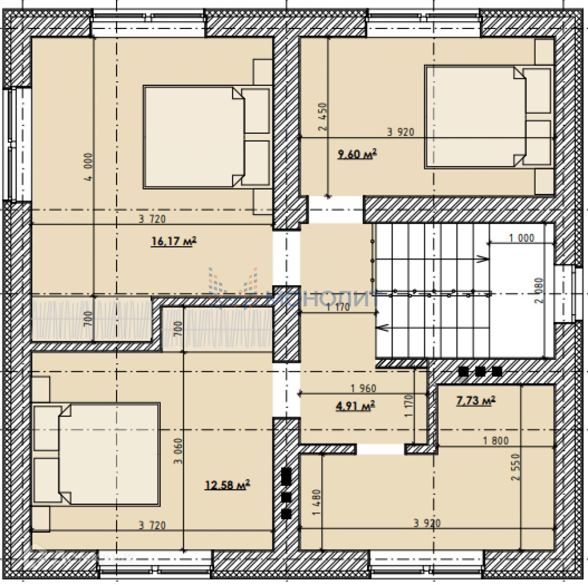 2 этаж - 3 спальни 10, 13, 16 кв.м., санузел