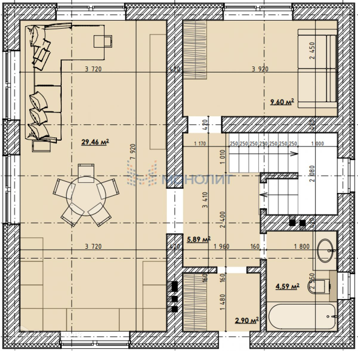 1 этаж - большая кухня-гостинная 30 м, спальня 9,6 м, санузел, прихожая, лестничный холл