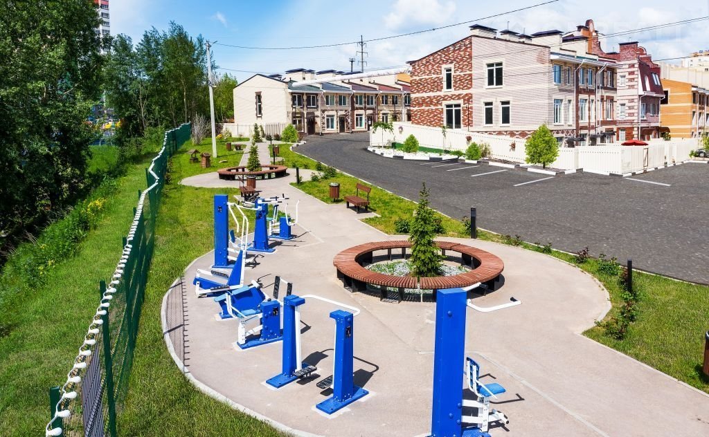 - тематически детские площадки для детей всех возрастов, зона уличных фитнес тренажеров для взрослых, футбольное поле. На поле игры по расписанию для детей и взрослых: футбол, волейбол, баскетбол и большой теннис