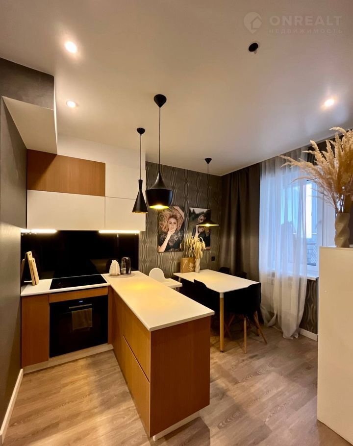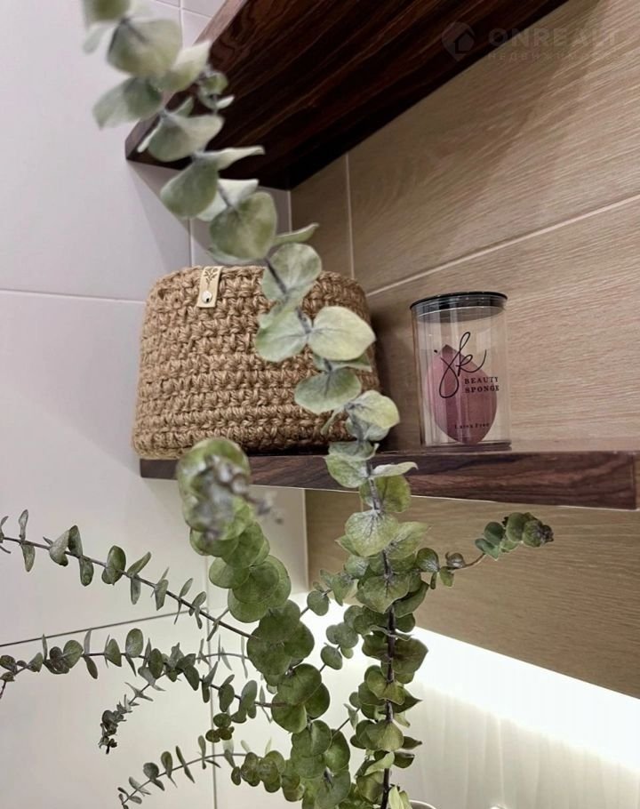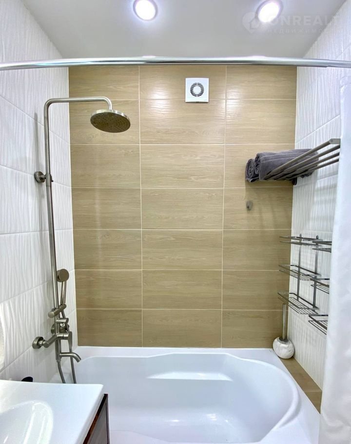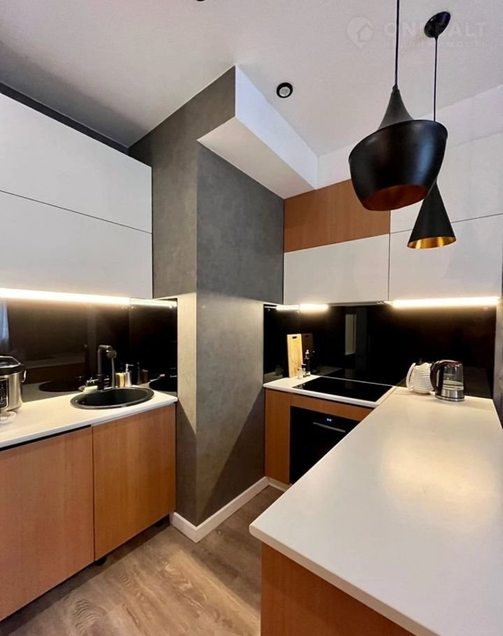 Вся квартира выполнена в едином современном стиле: кухонный гарнитур в белых тонах с сочетанием под дерево, ванная комната в плитке светлых тонов с сочетанием плитки под дерево, зона студии и прихожей в серо-бежевых тонах с чёрными акцентами.