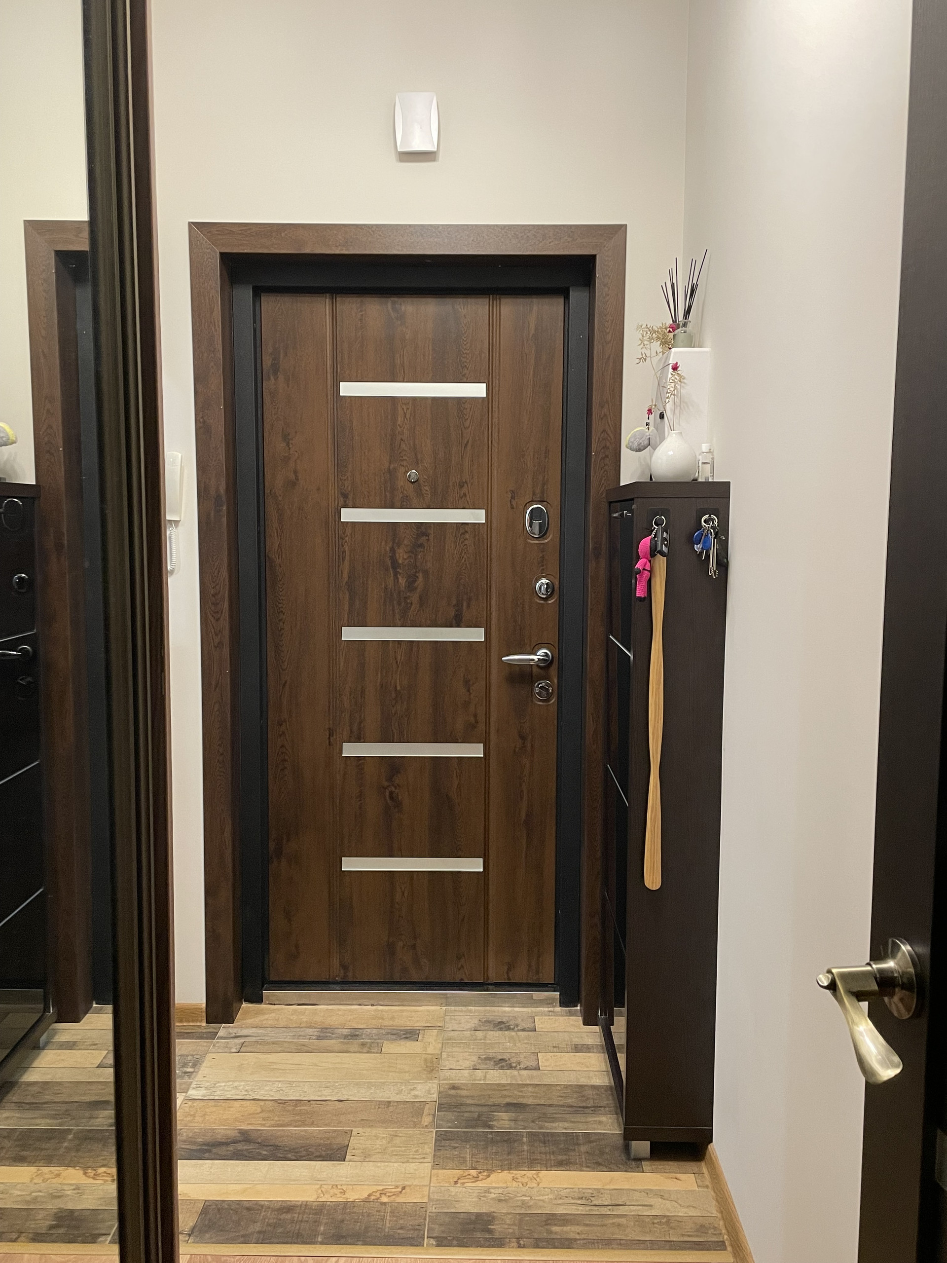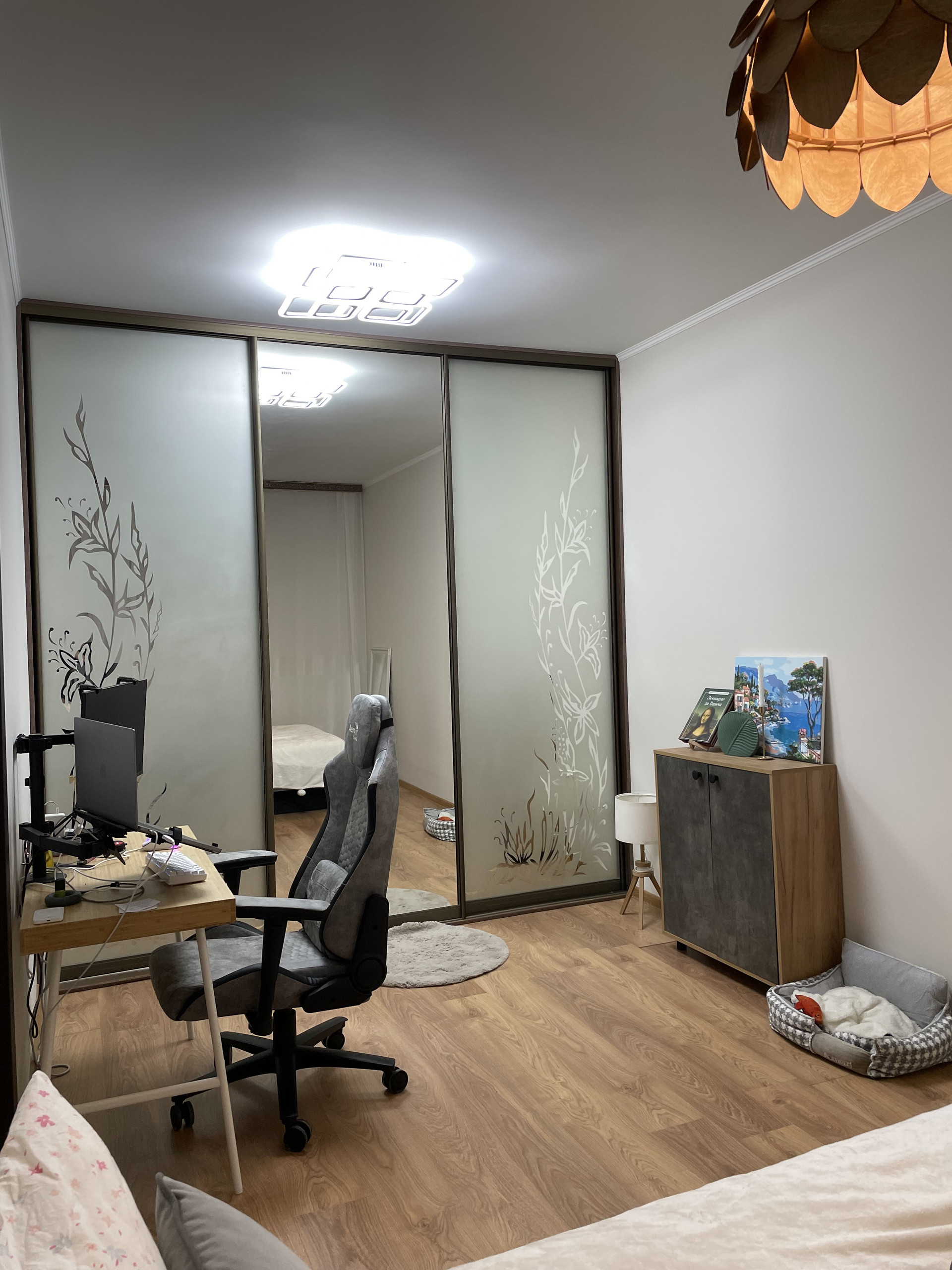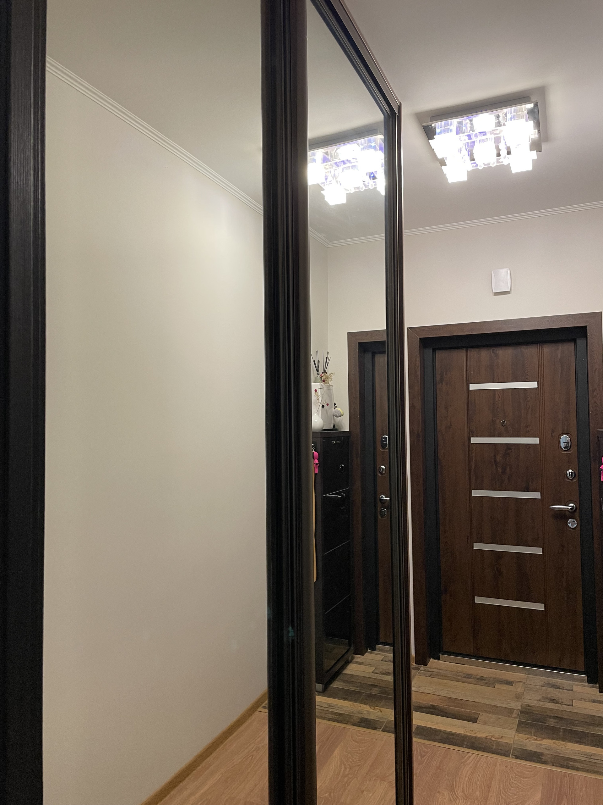 Предусмотрена удобная и большая система хранения вещей, а именно два шкафа стенли. Один в коридоре, куда можно вешать вещи при входе в квартиру и складывать коробки с обувью, второй в комнате — для платьев/костюмов/брюк и домашней одежды. Шкаф в спальне разделен на 3 секции, одна полностью моя, вторая мужа, что очень удобно. Третья общая ;) примечательно, что на семью из двух человек шкафы заполнены не полностью и еще имеют место хранения.