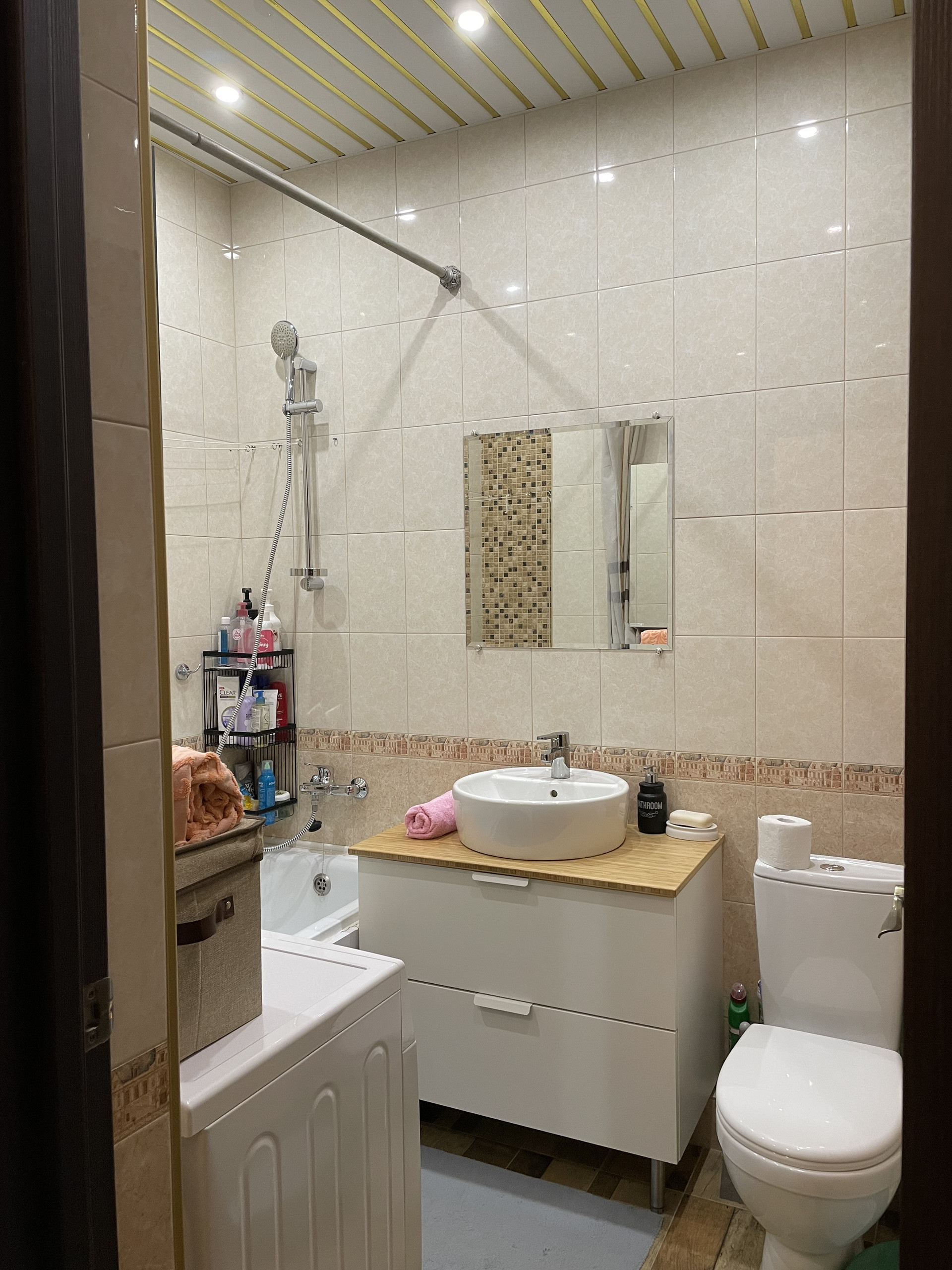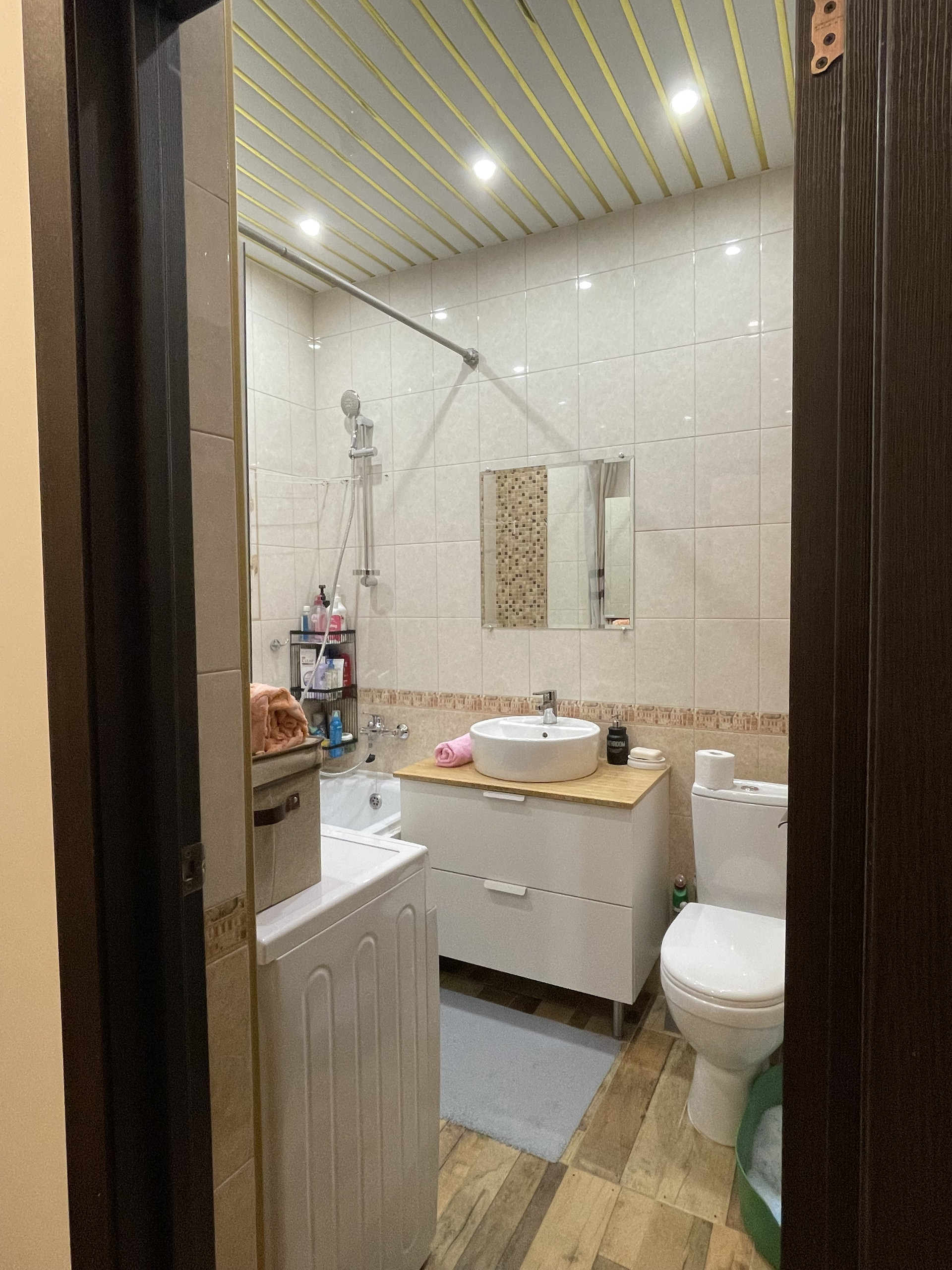 Санузел совмещенный, полностью в плитке, также плитка в коридоре. Во всей остальной квартире ламинат классического, подходящего к любому ремонту оттенка. В квартире есть лоджия, на лождии тоже есть система хранения, чтобы не было бардака, на полу на лоджии тоже ламинат.
