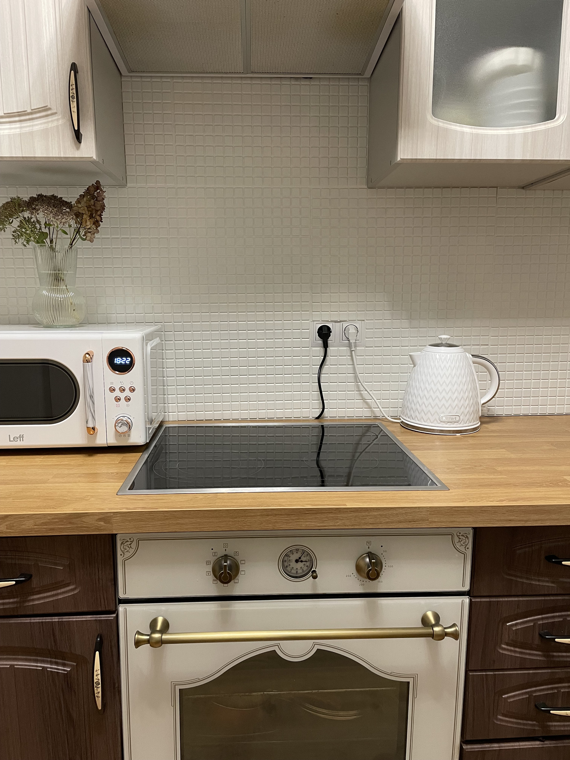 Оставляем почти все, кроме холодильника, стиральной машинки, телевизора и микроволновки. Духовка, плита, вытяжка, кухонный гарнитур остаются новым хозяевам. Все рабочее.