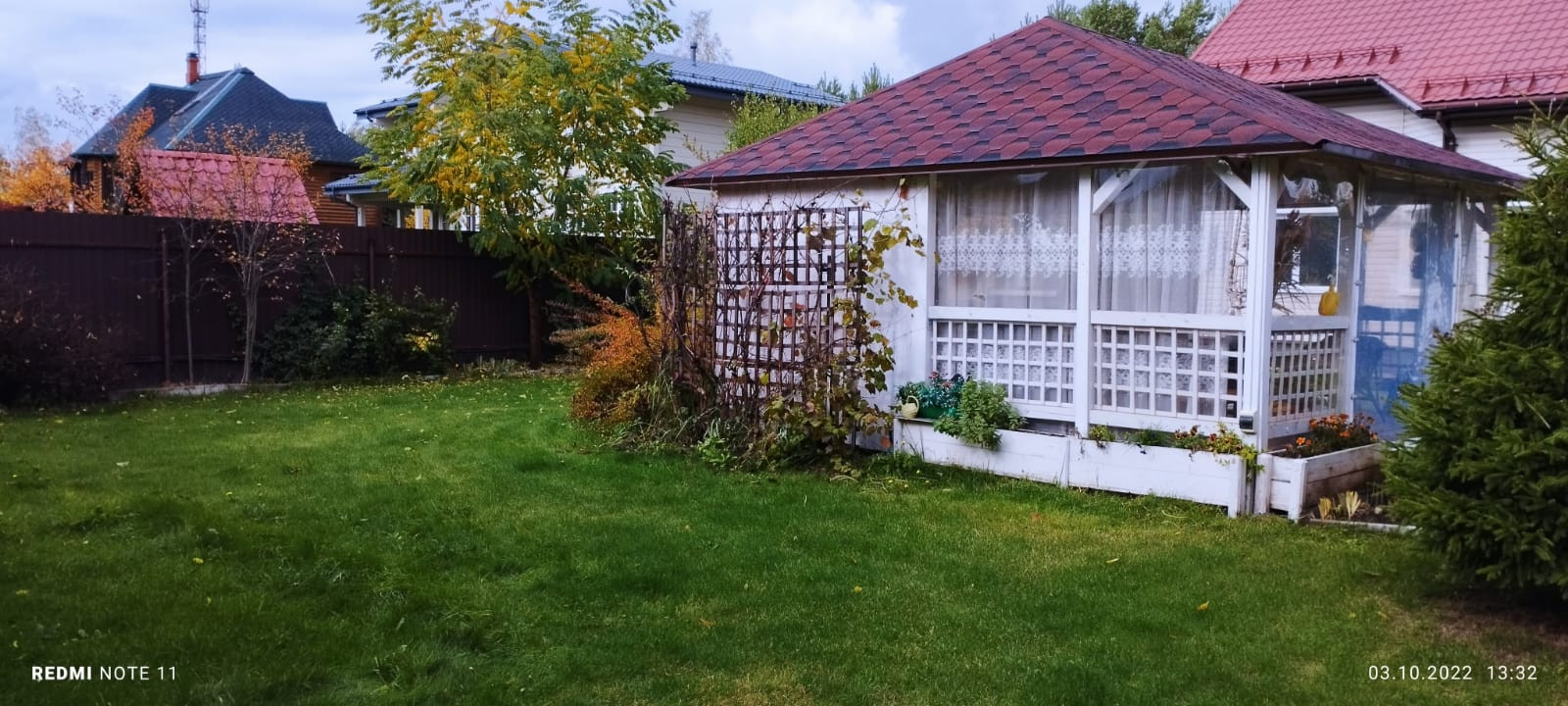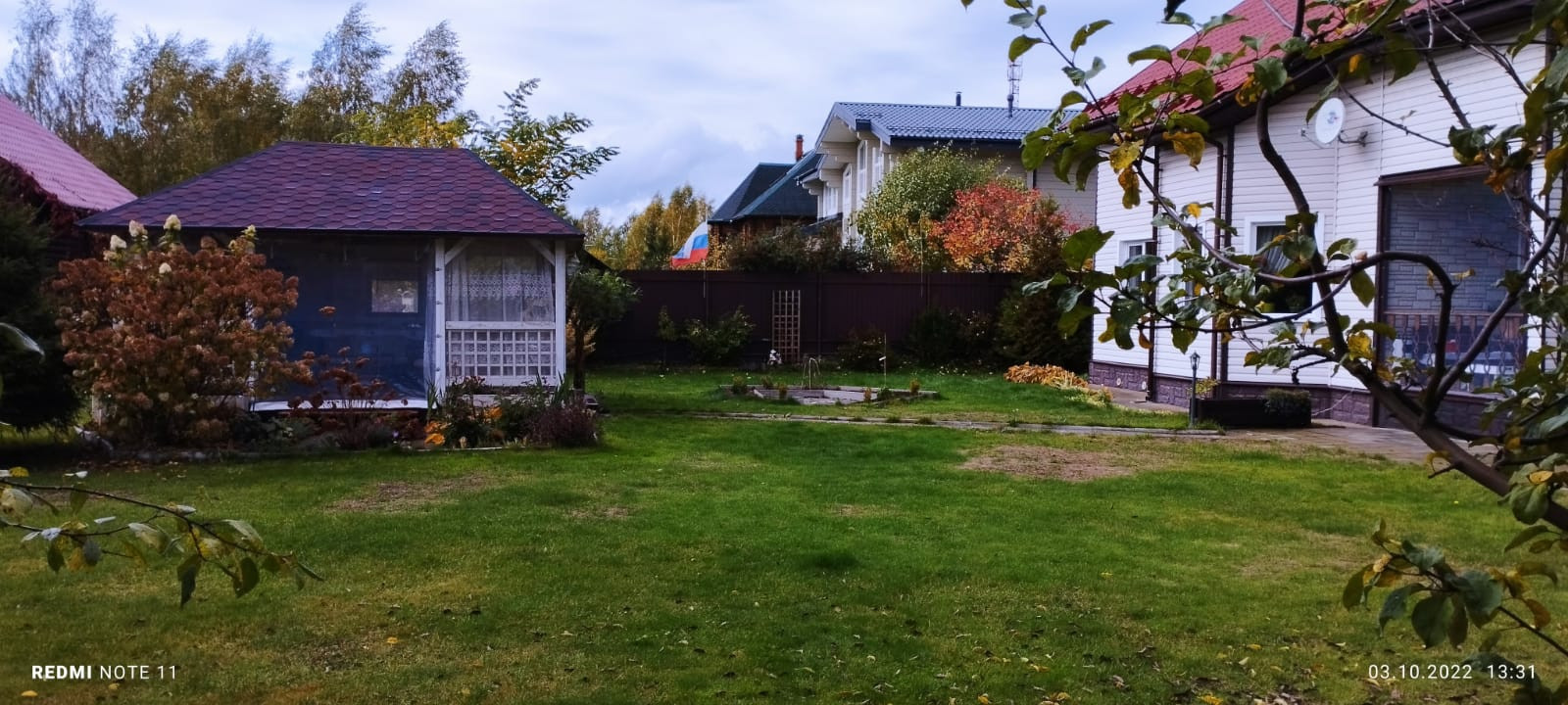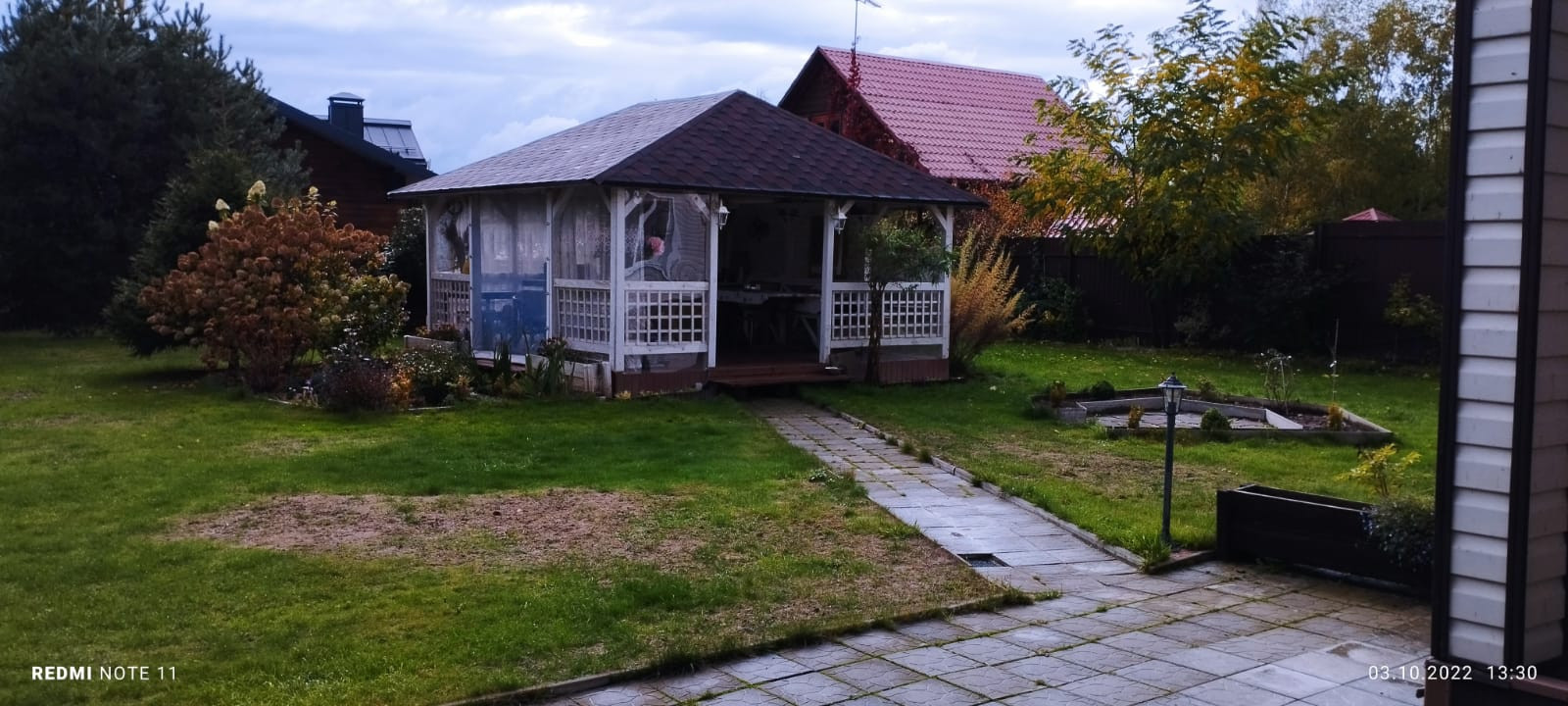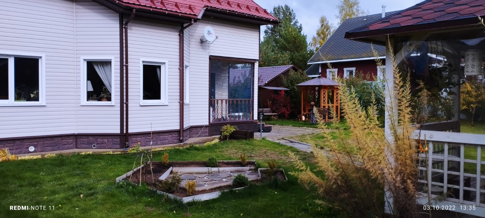 На территории расположены: гараж-мастерская 9х6 метров, беседка 5х5 с остеклением из монолитного поликарбоната, баня 2.5х6 м, огород 11х6 м. (теплица 3х6, и 7 грядок).