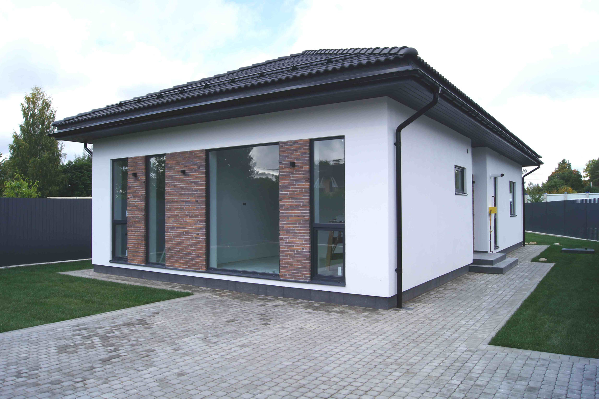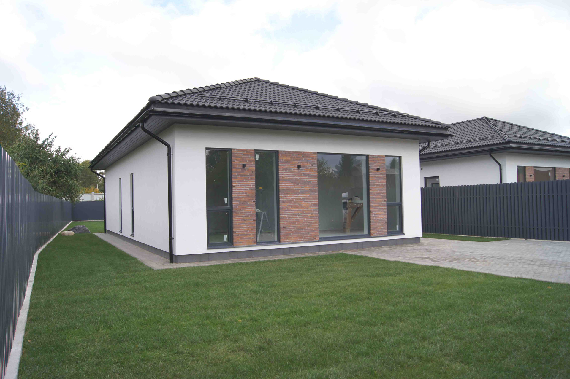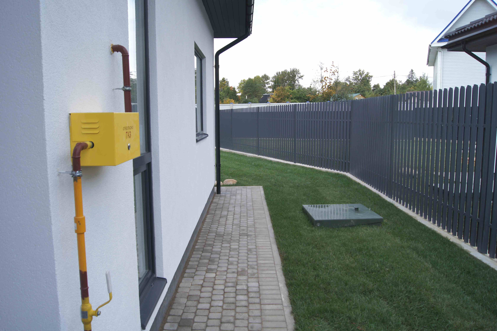 Внутри: 3 спальни, гостиная-кухня (32кв.м), два санузла, гардеробная, котельная, терраса. Есть выход на 2 этаж (технический). Коммуникации: центральный газ (подключен газовый котел), 15кВт электричества, водопровод от собственного колодца. Канализация – локальные очистные сооружения.