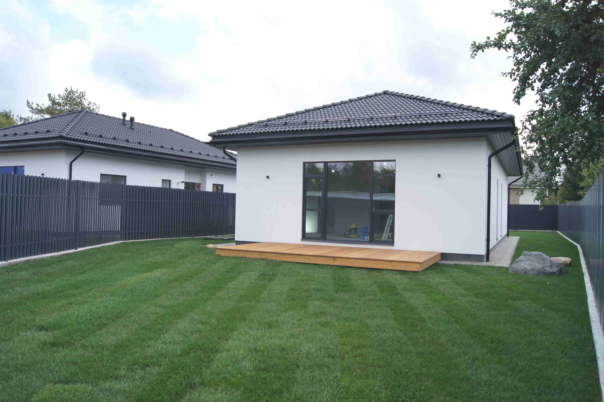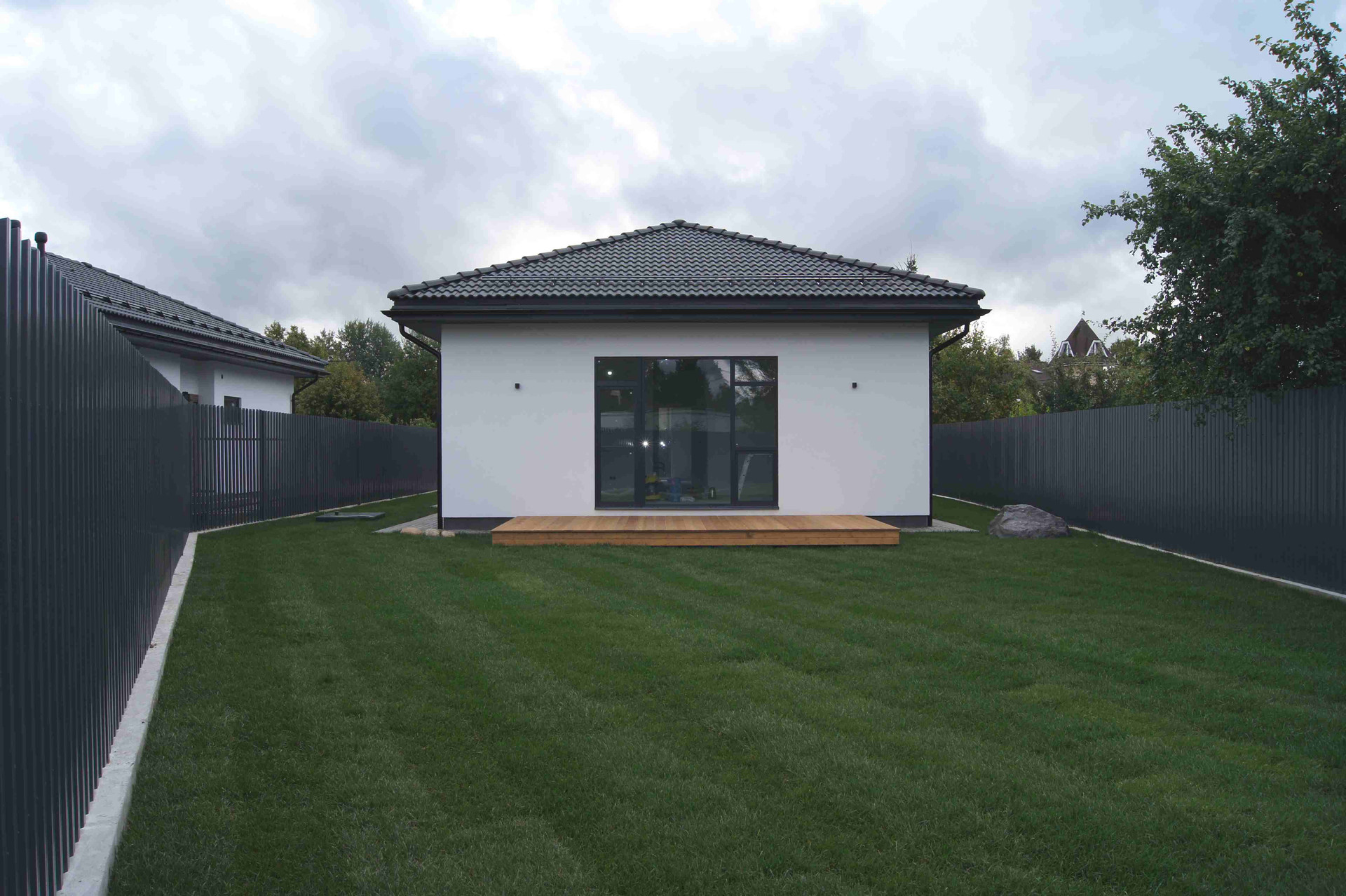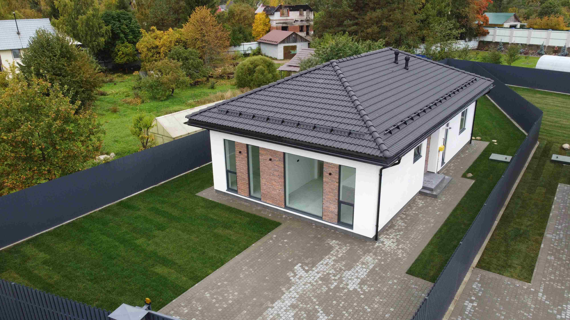 Внутри: 3 спальни, гостиная-кухня (32кв.м), два санузла, гардеробная, котельная, терраса. Есть выход на 2 этаж (технический). Коммуникации: центральный газ (подключен газовый котел), 15кВт электричества, водопровод от собственного колодца. Канализация – локальные очистные сооружения.
