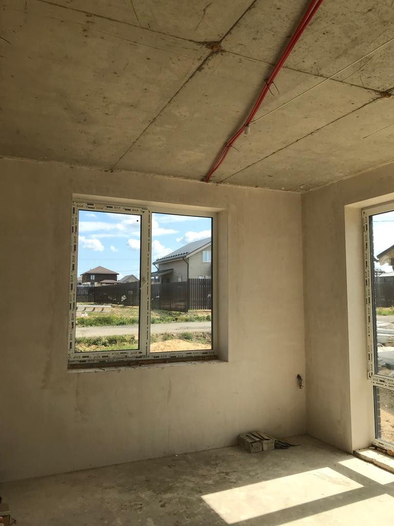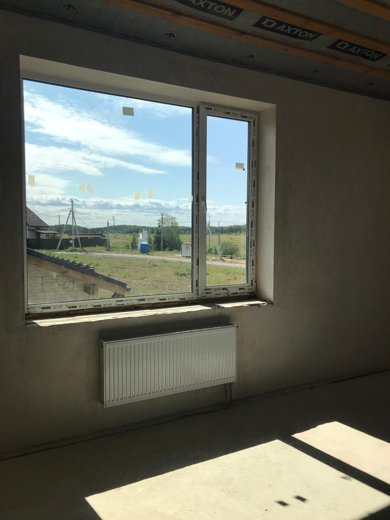 На 1 этаже теплые полы, на 2 этаже установлены радиаторы. Выполнена стяжка пола, стены отштукатурены
