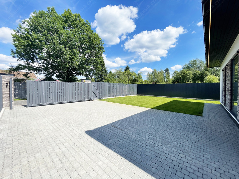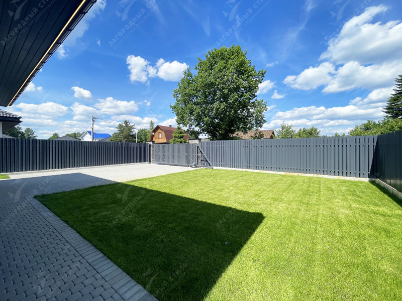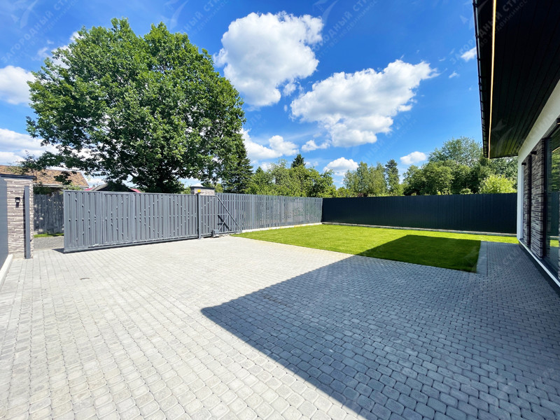 На участке сделано благоустройство (мощение, рулонный газон, сосны, забор с откатными воротами).
