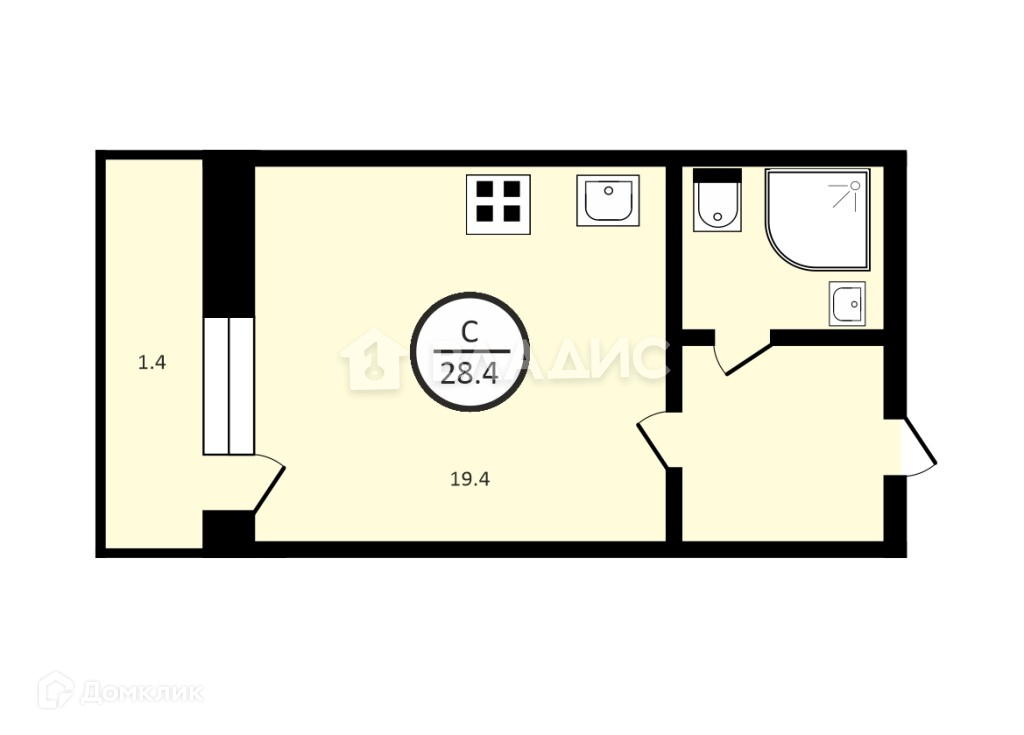Квартира правильной прямоугольной формы общей площадью 28.4 кв. м.