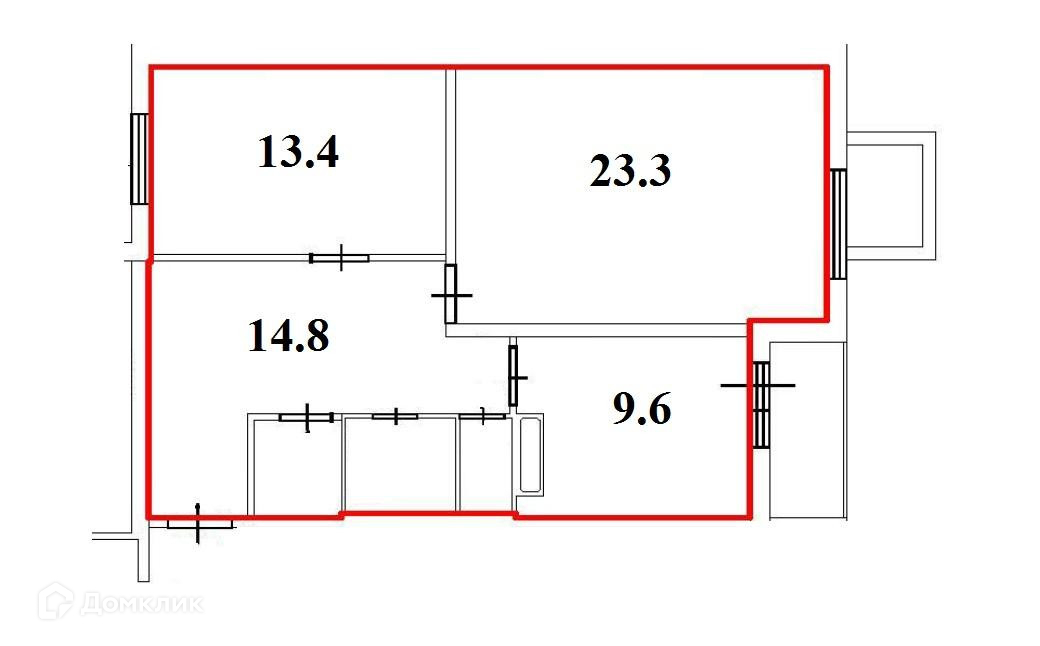 Изолированные комнаты 23.3 кв.м. и 13.4 кв.м. Кухня 9.6 кв.м.