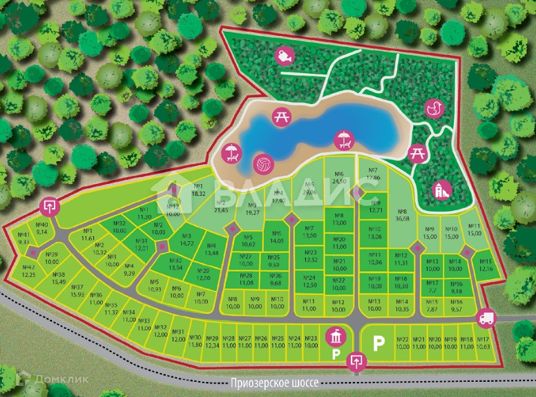 В поселке есть небольшое живописное лесное озеро с пляжем (в 100 метрах от участка). Многие соседи живут круглогодично.