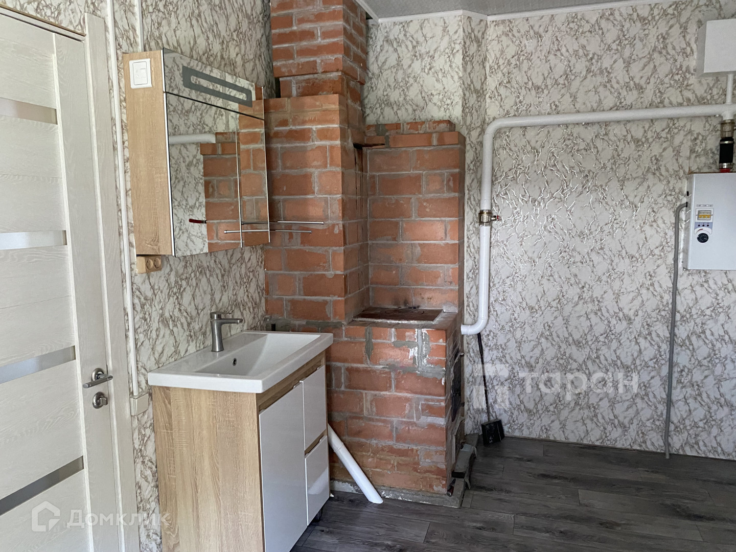 Дом построен из пеноблока , обшит сайдингом и утеплителем. Отопление печное и электрическое. Установлен электрокотел. Газ подведен к дому , осталось завести в дом .