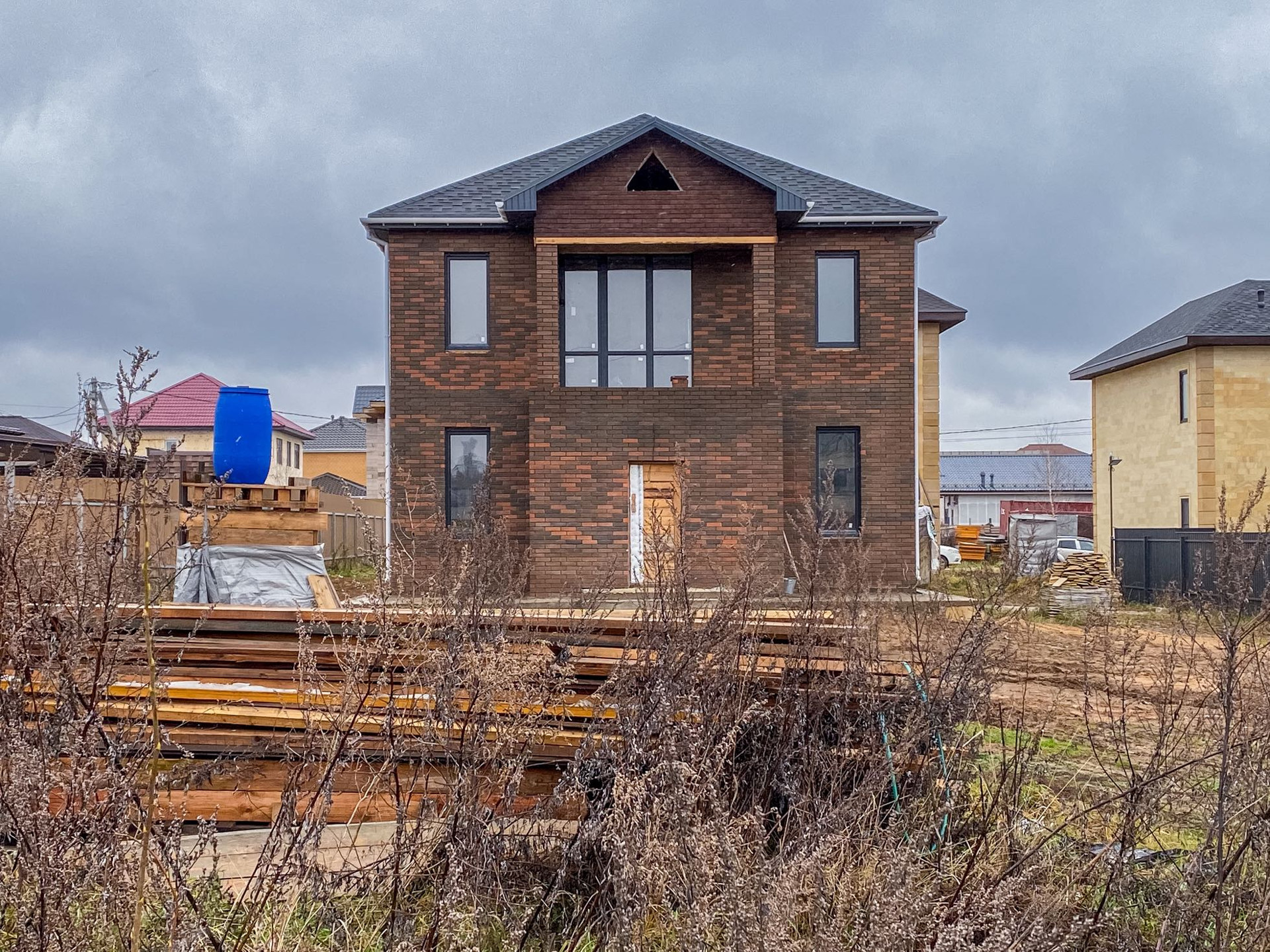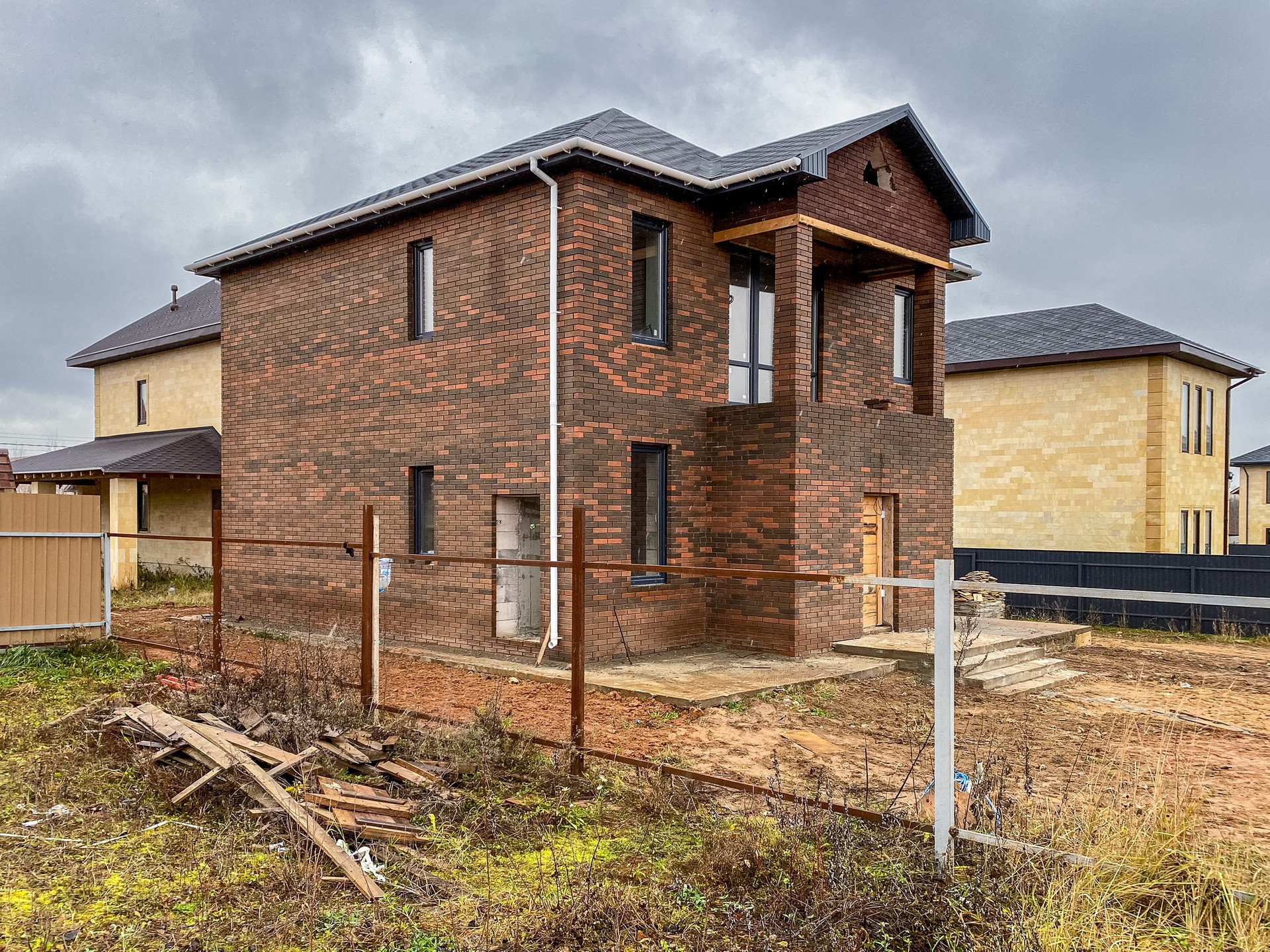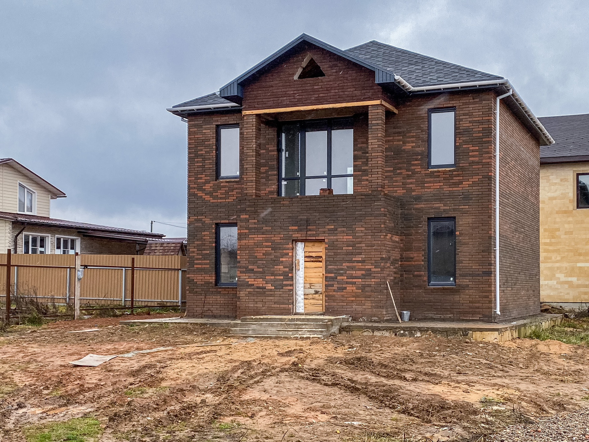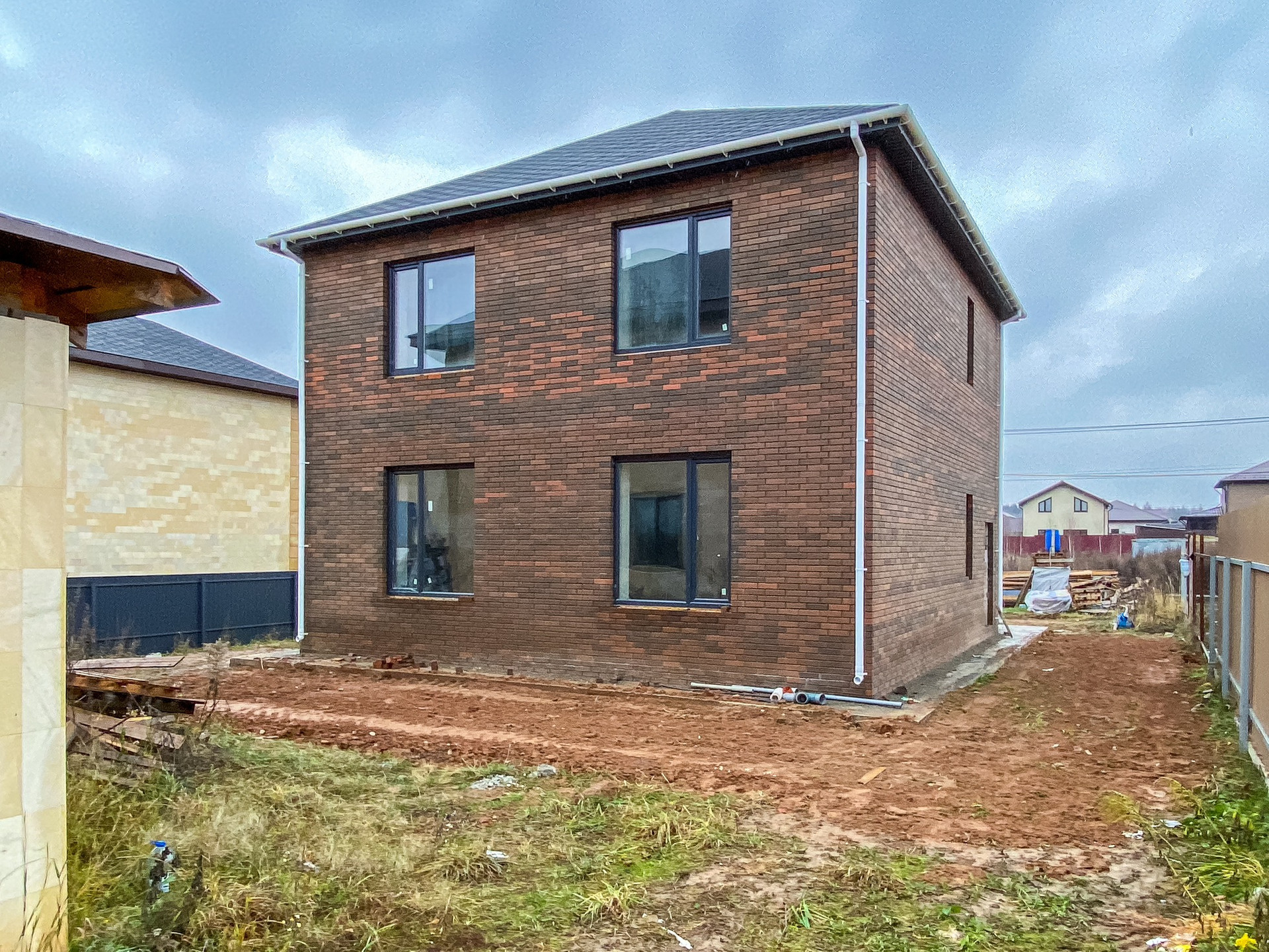 Дом с предчистовой отделкой, построен из газоблока D500, облицован кирпичом баварской кладкой, фундамент - плита с двойным армированием, мягкая кровля, утепление мансарды 200мм, отмостка с армированием (бетон М400).