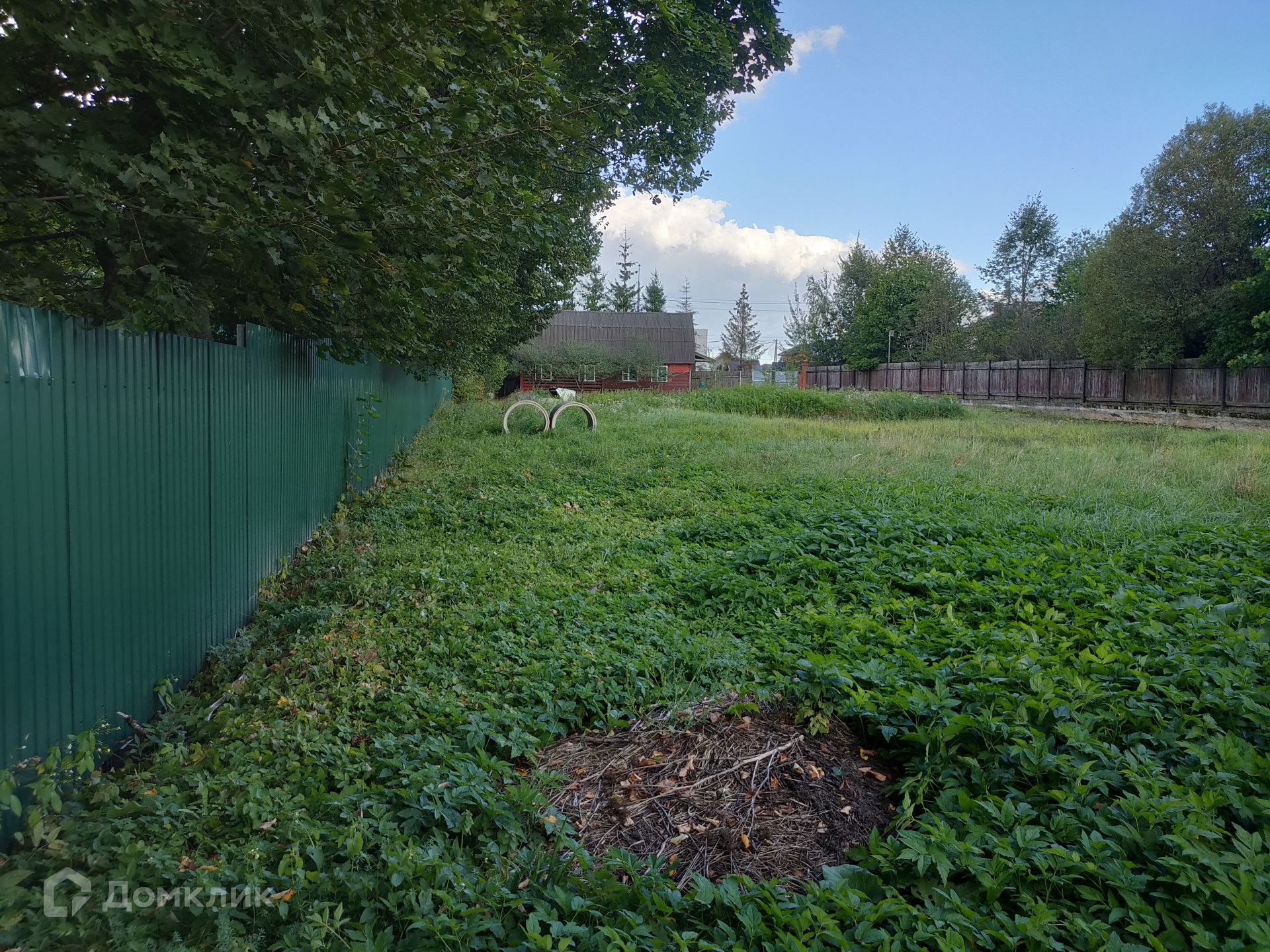 С двух сторон участок огорожен металлопрофилем, от соседей слева деревянный забор. Ограды справа от ближайших соседей нет.