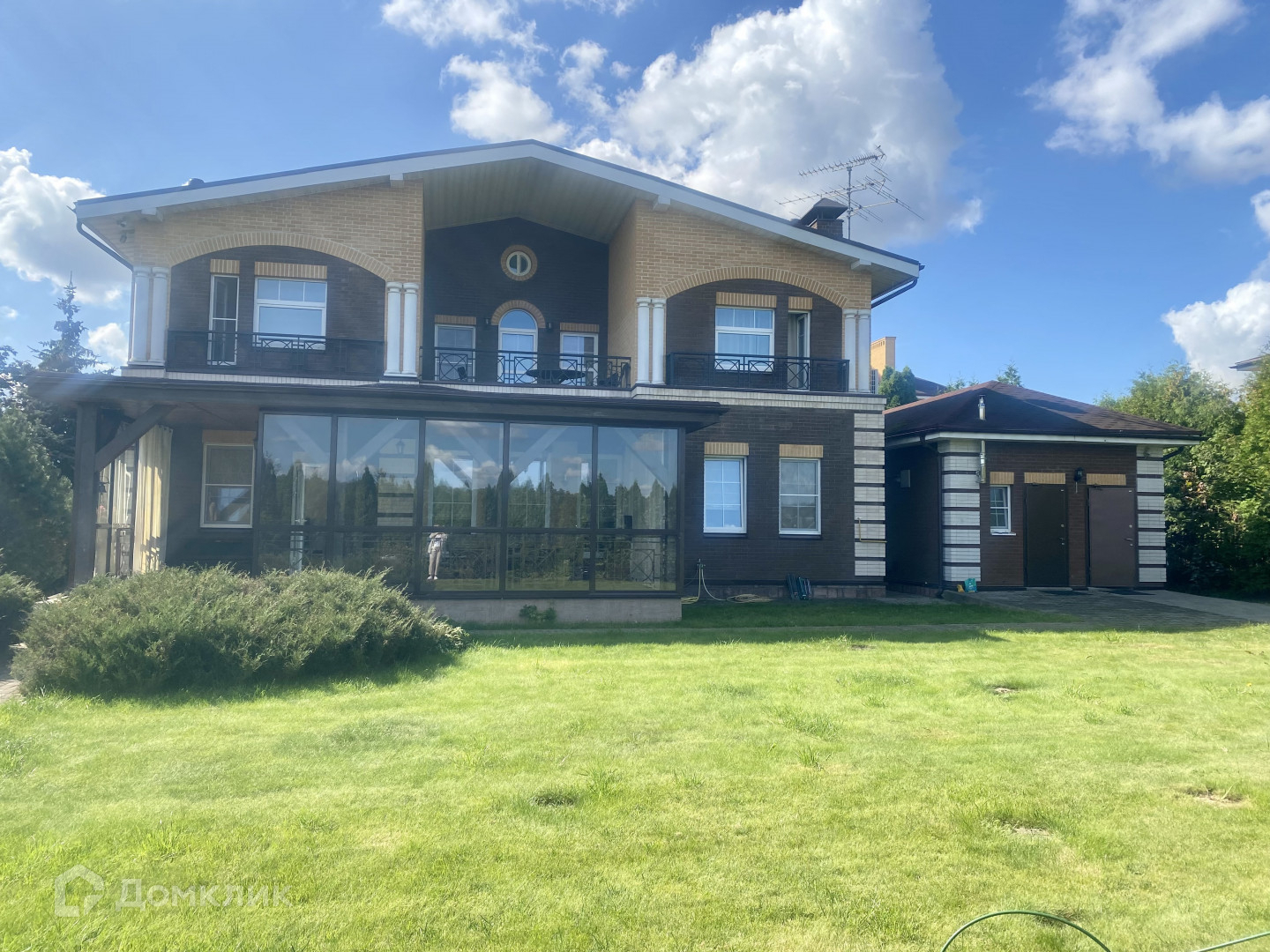 Дом-  216м2., Фундамент- ж/ б плита, стены кирпичные с утепление и облицованный керамическим кирпичом. Перекрытие- плиты. Крыша - мягкая черепица.