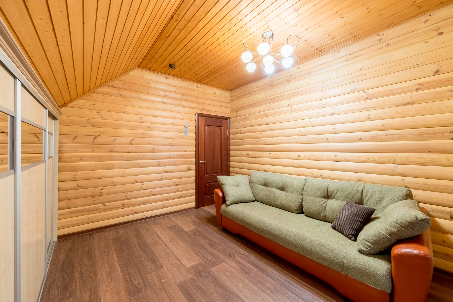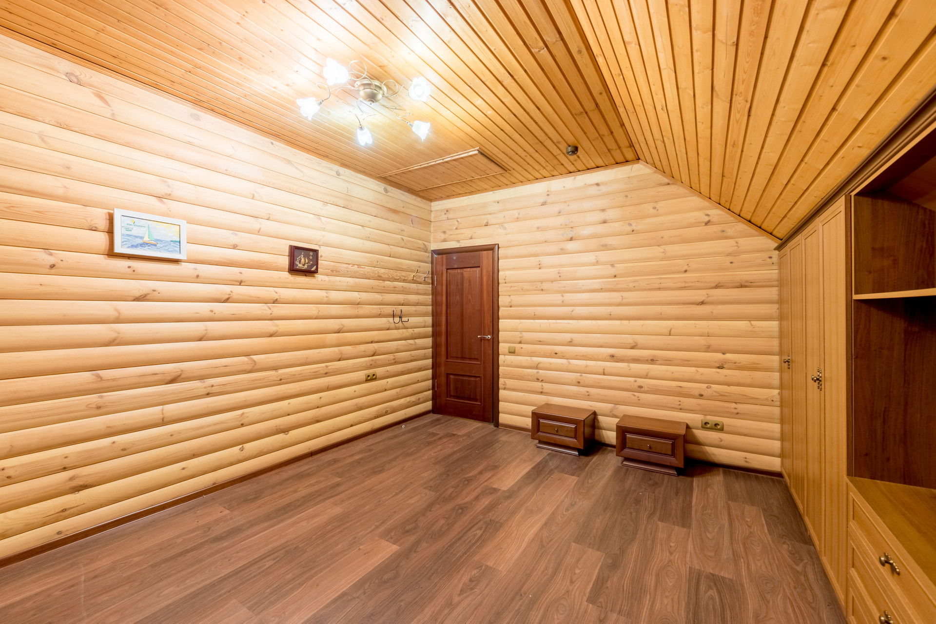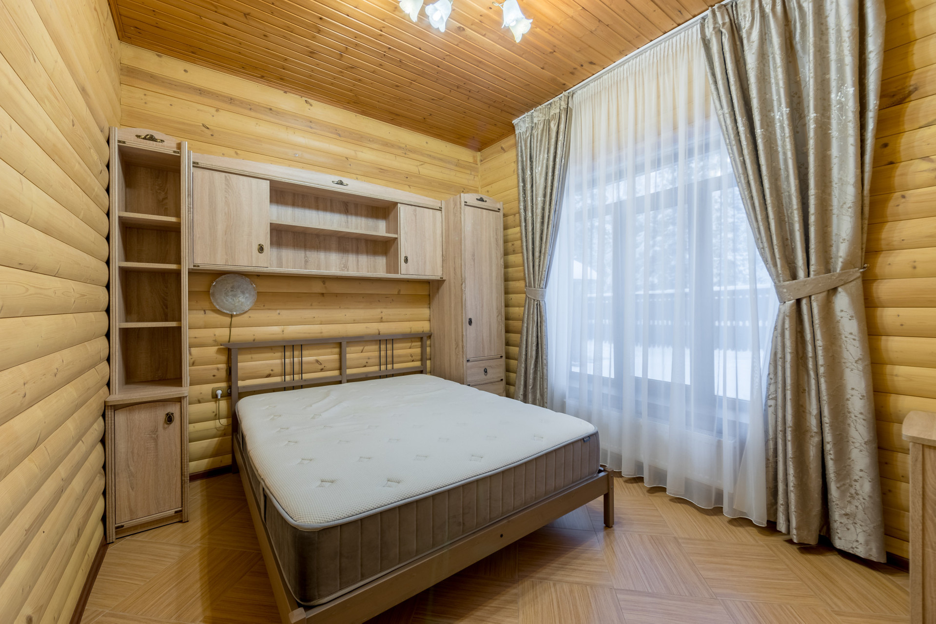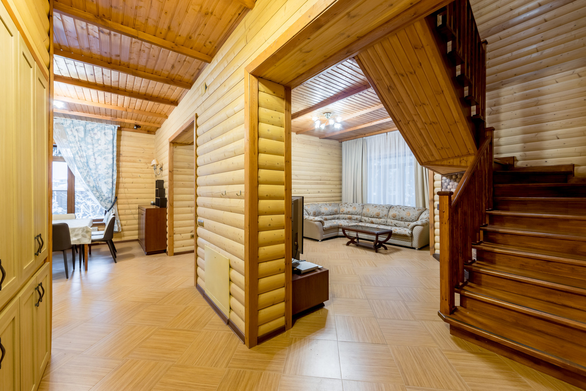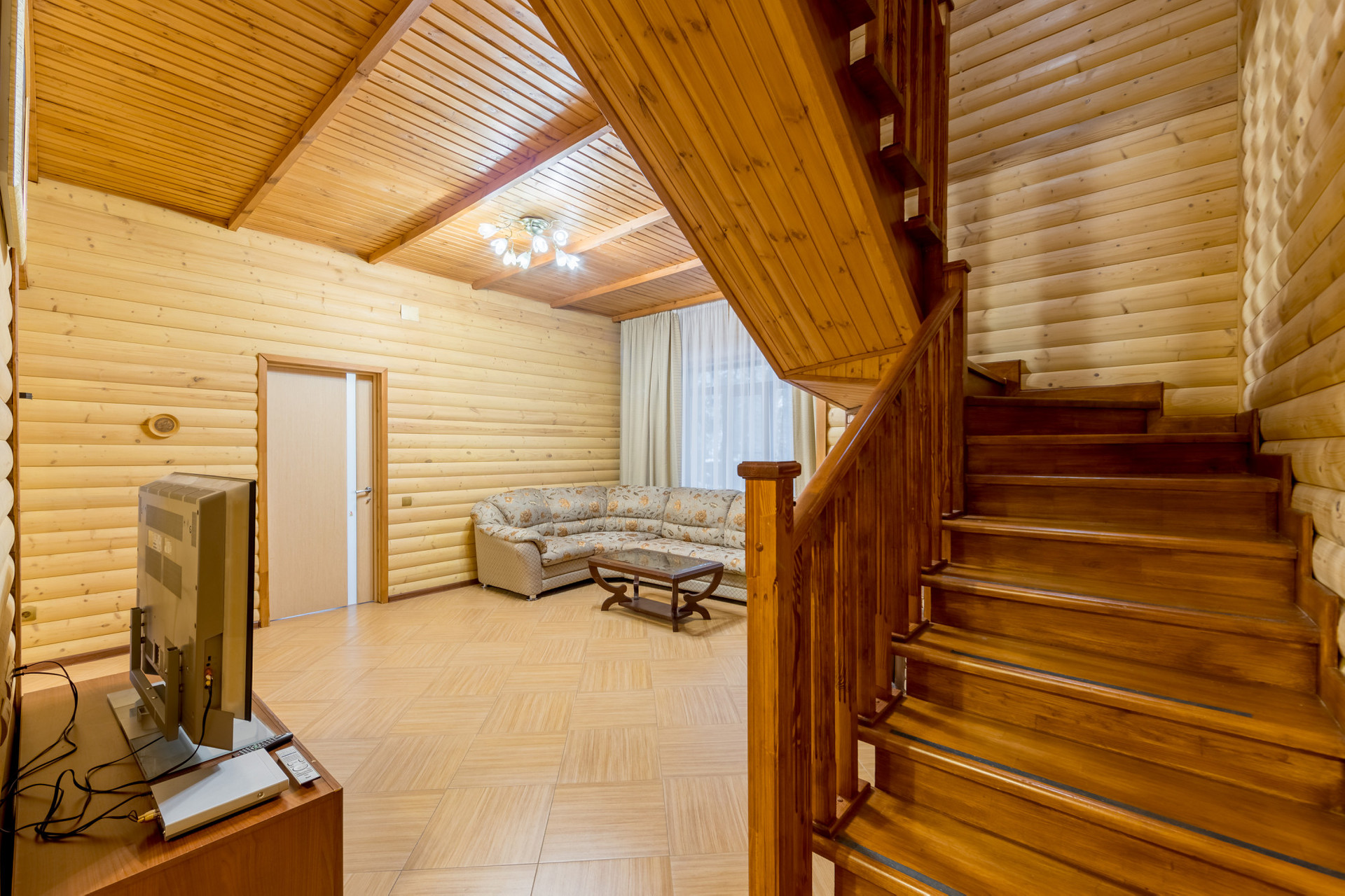 Дом возведен из пенобетона и облицован деревянным блок-хаусом. Внутренние стены и потолки также деревянные. Между этажами железобетонные перекрытия. Окна – пластиковые стеклопакеты. Подключены централизованные коммуникации: газ, вода, канализация и электричество.
