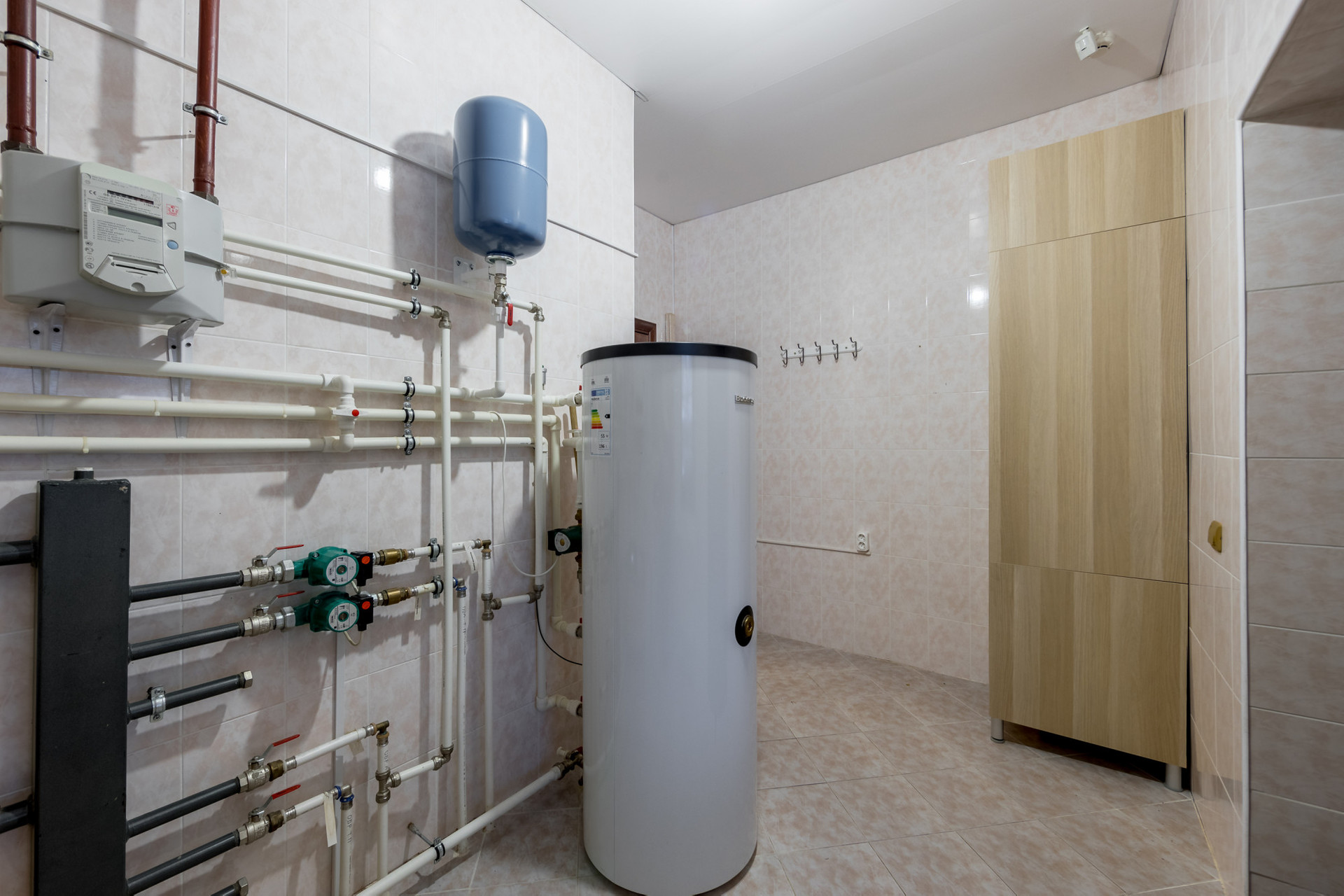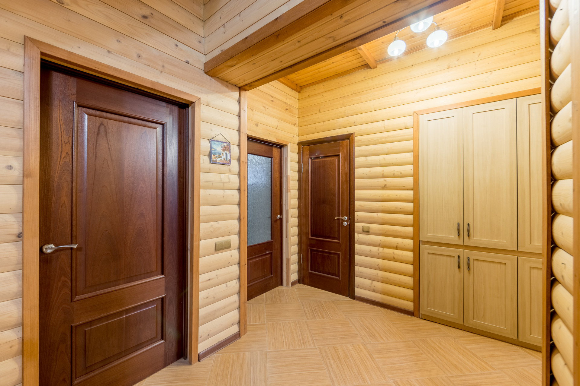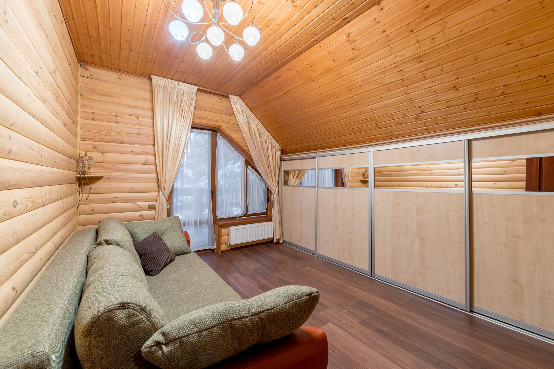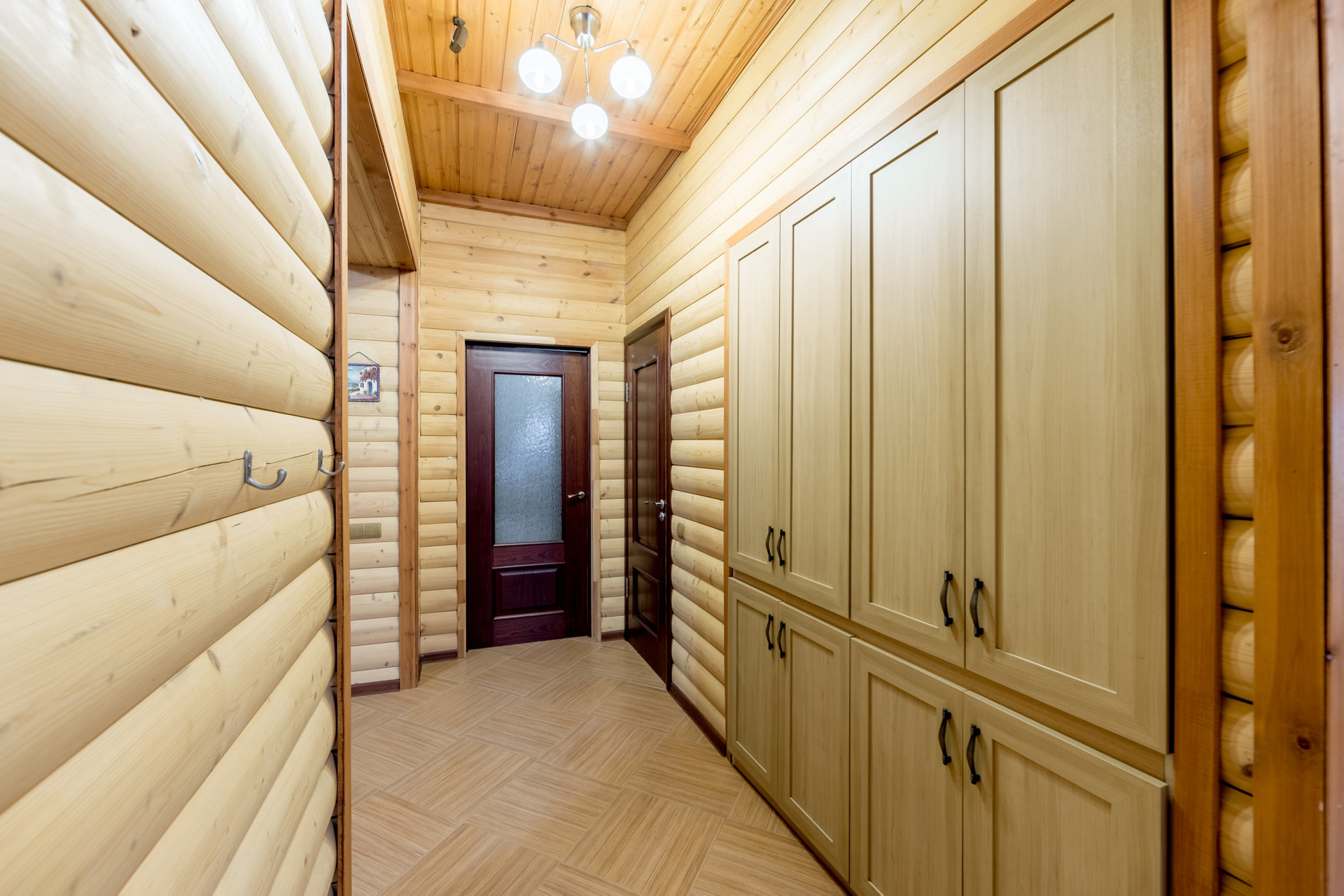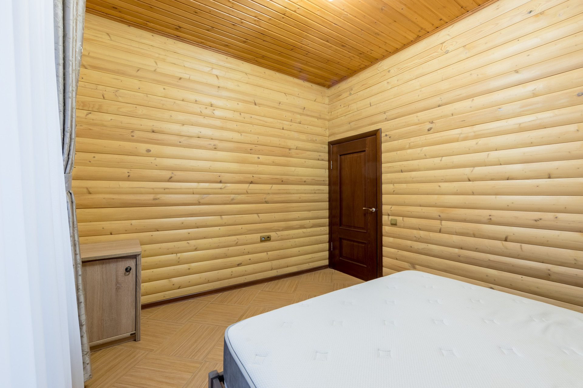 Дом возведен из пенобетона и облицован деревянным блок-хаусом. Внутренние стены и потолки также деревянные. Между этажами железобетонные перекрытия. Окна – пластиковые стеклопакеты. Подключены централизованные коммуникации: газ, вода, канализация и электричество.