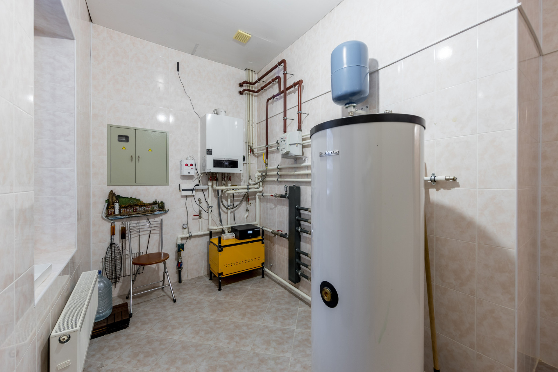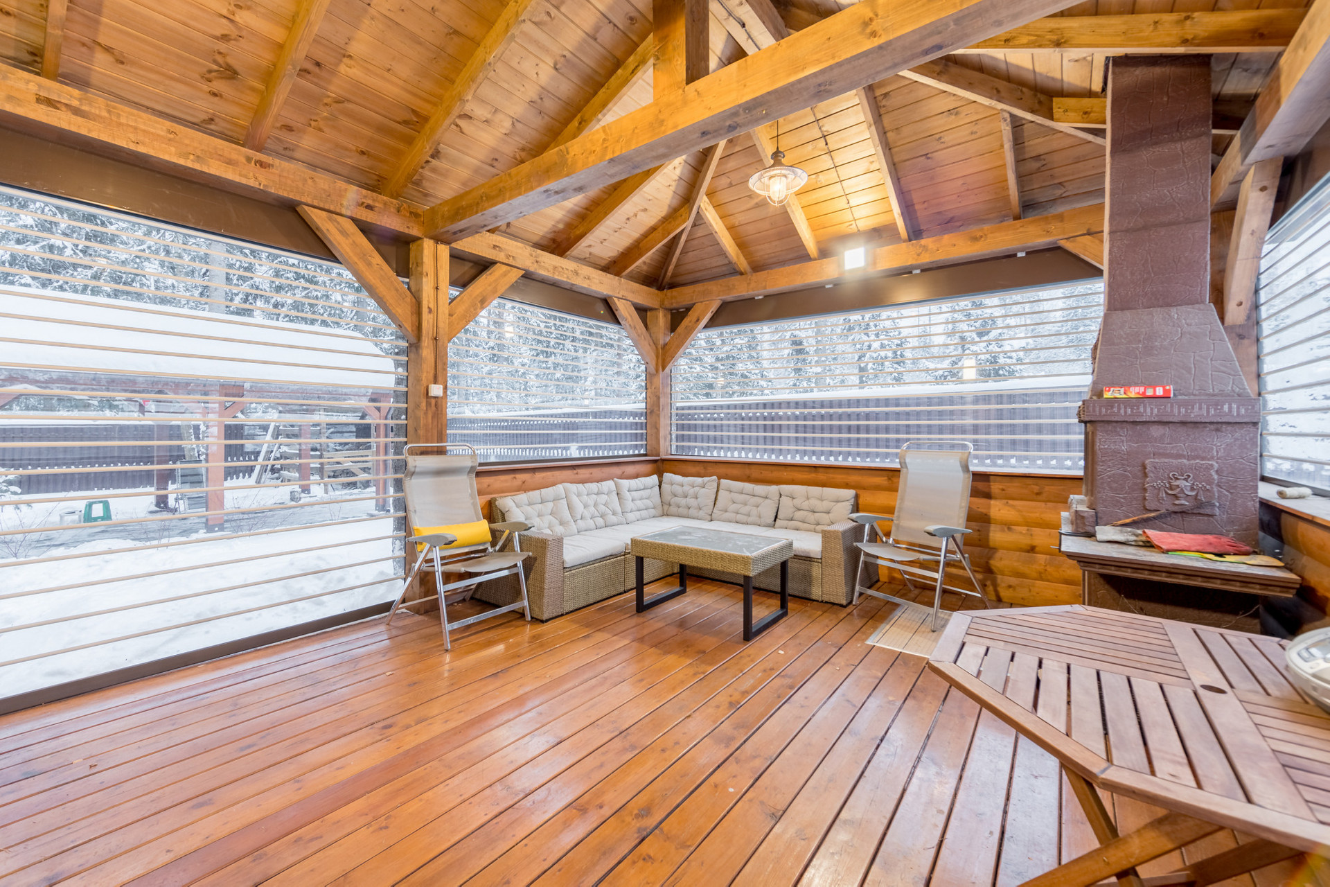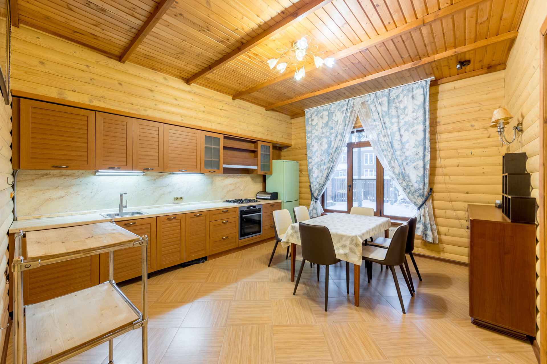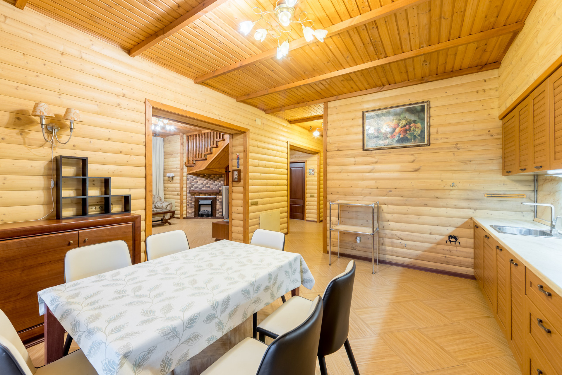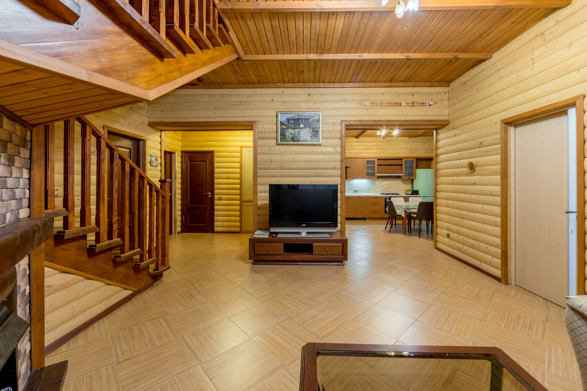 Первый этаж: крыльцо, прихожая, кладовка, просторная гостиная, объединенная с кухней-столовой, оборудованной мебелью и бытовой техникой, небольшая комната (может использоваться как гостевая спальня или рабочий кабинет), ванная комната с душевой кабиной и сауной, котельная с выходом на крытую веранду площадью 24 кв. м, остекленную поликарбонатом с автоматическим убирающимся механизмом и мангальной зоной.