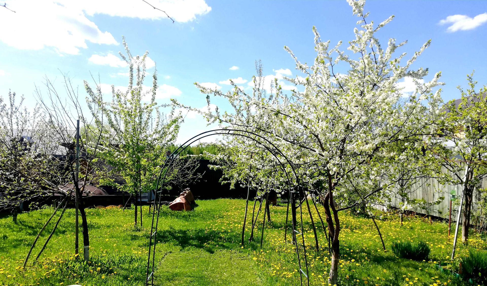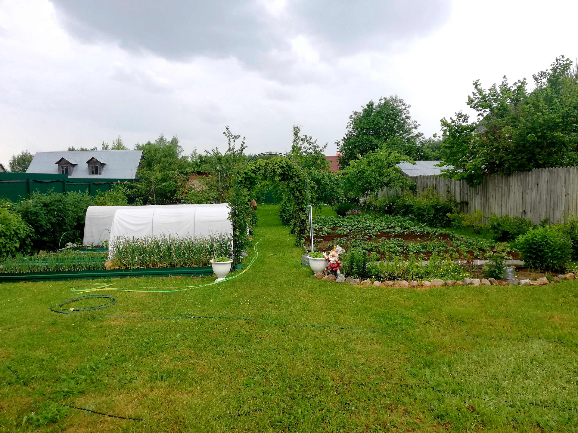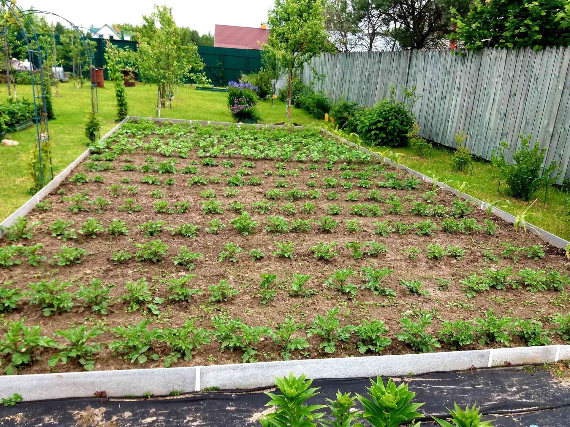 На участке проведено зонирование. Под строительство жилого дома отведено место впереди участка, в глубине находится огород и сад. Под овощи и клубнику установлены оцинкованные грядки с полимерным покрытием, дёрн полностью снят и насыпан плодородный чернозем. Имеется огороженное поле 5×10 под посадку картофеля, в котором выбраны все сорняки и корни. В центре в проходе установлены арки с актинидией и цветник. Посажен виноград кишмиш разных цветов, смородина красная и черная, крыжовник, голубика, малина красная и желтая, ежевика, ежемалина, ирга, йошта, жимолость. Плодовые деревья в саду: яблони, груши, вишни, черешни, сливы, терн, черноплодная рябина. Сад молодой, плодоносит ежегодно, урожай отменный! Все насаждения с указанием сортов занесены в карту посадок.