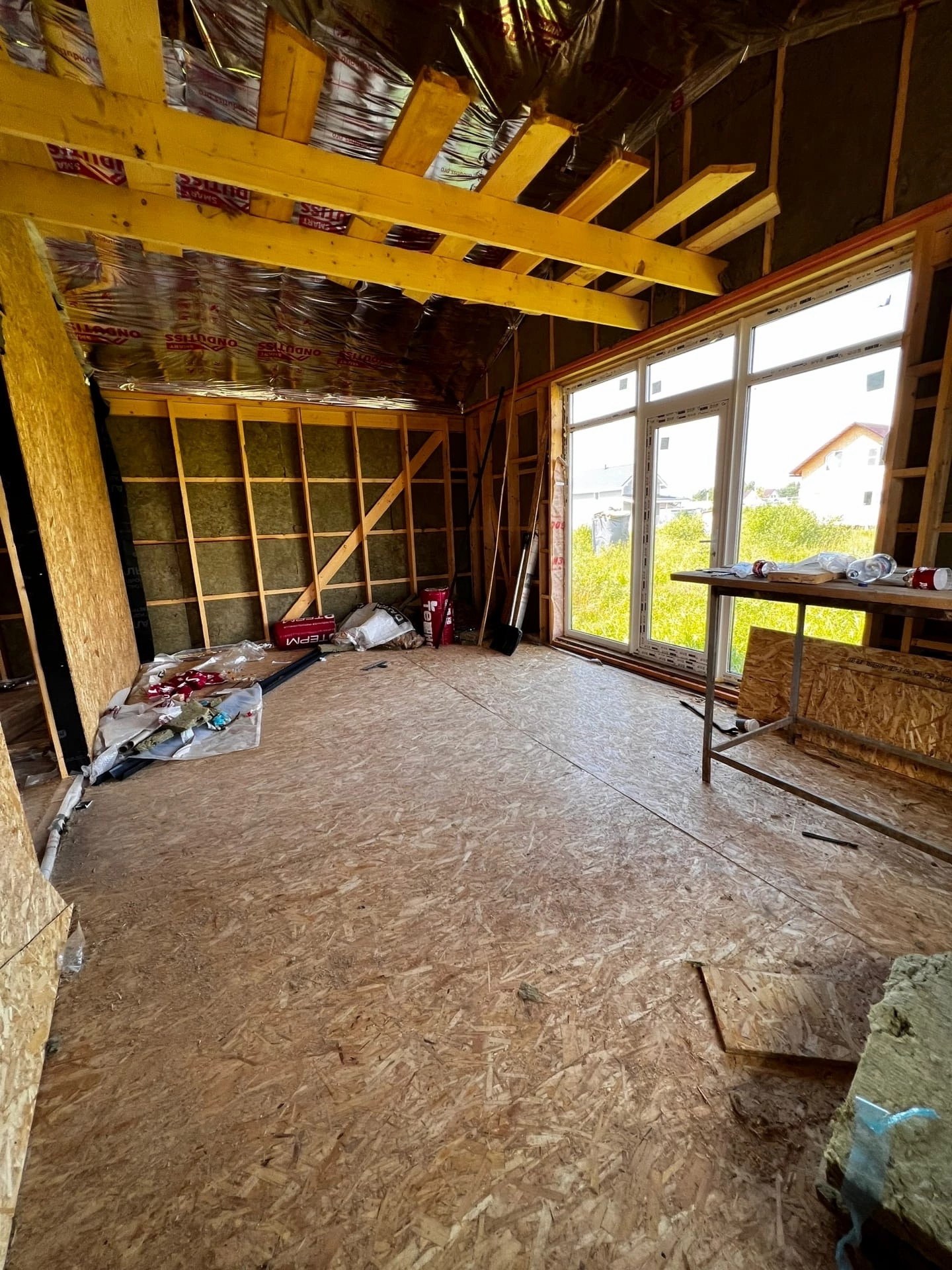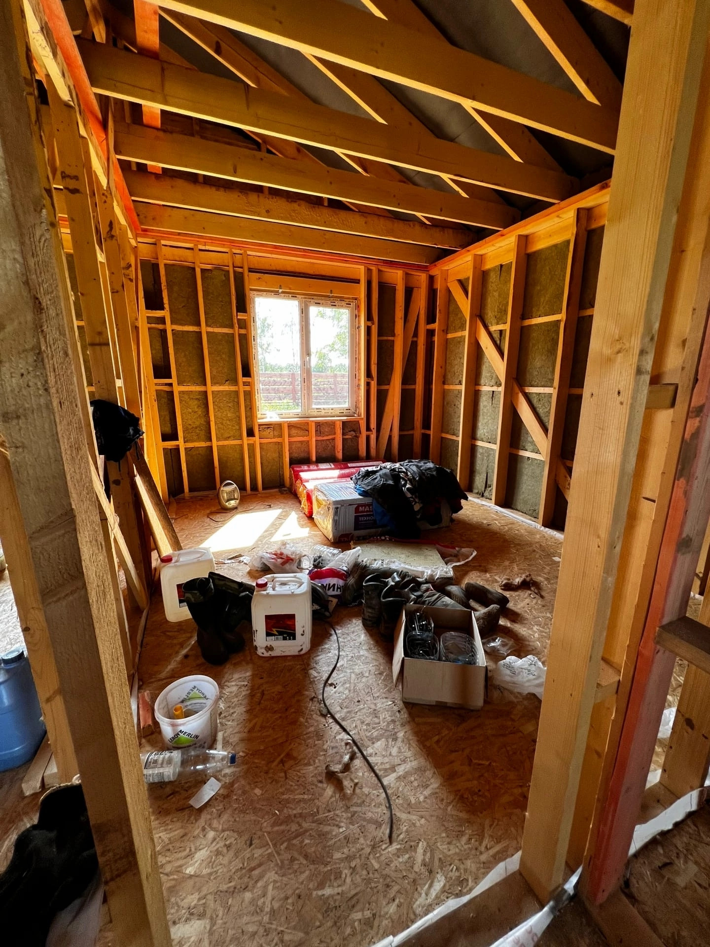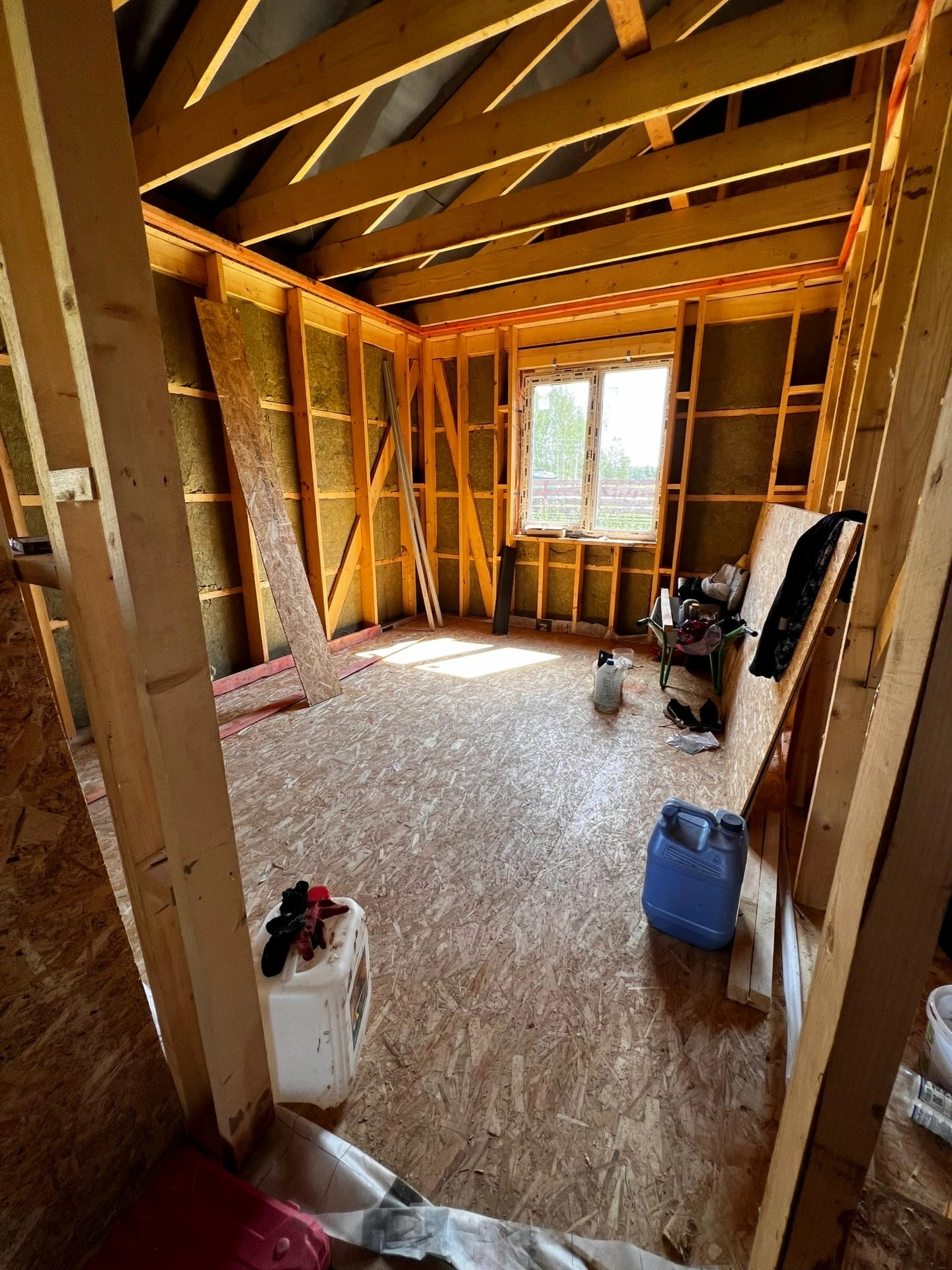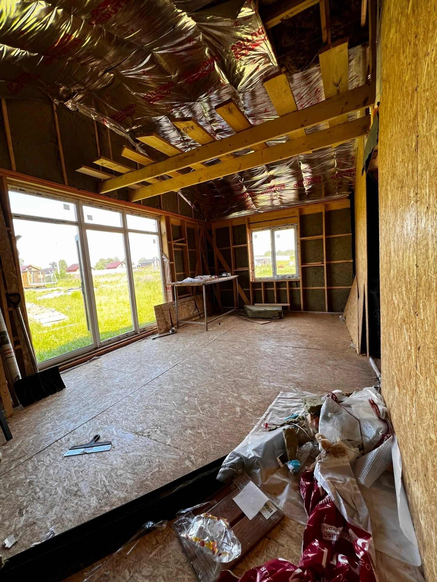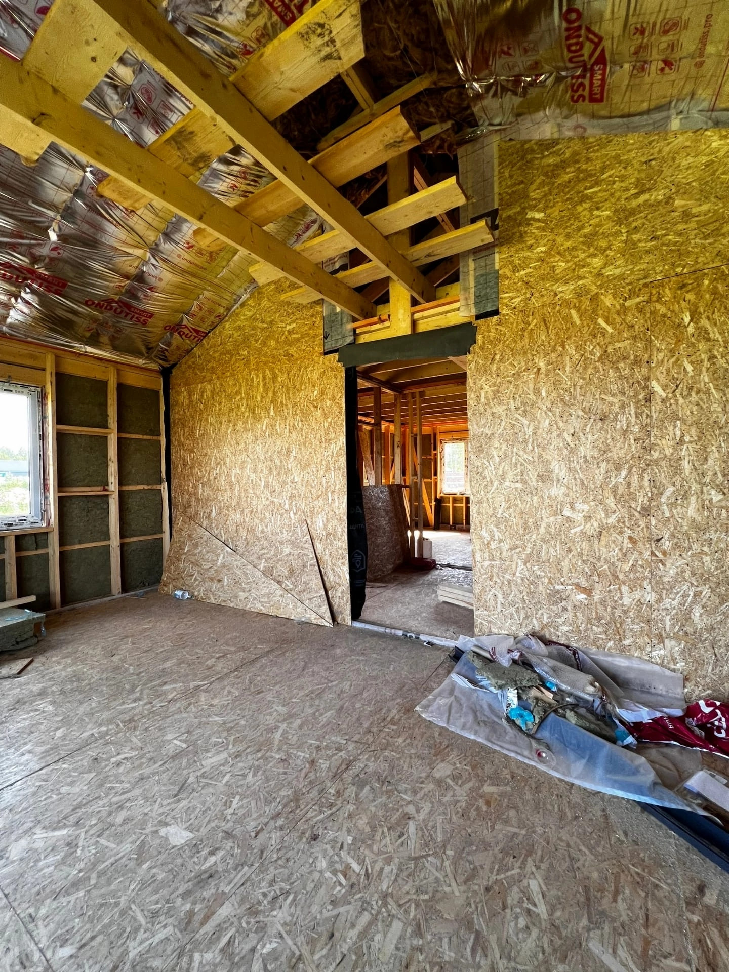 На данный момент проведена черновая отделка. Все стены и внутренние и внешние в гипсокартоне с утеплителем, электрика по всему дому.