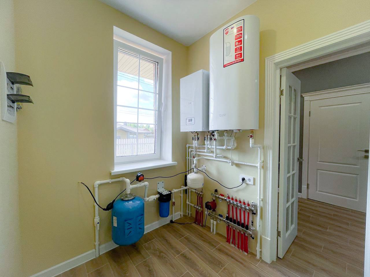 Отопление: электрический котел, система « водяные ТЕПЛЫЕ ПОЛЫ» по всему периметру дома