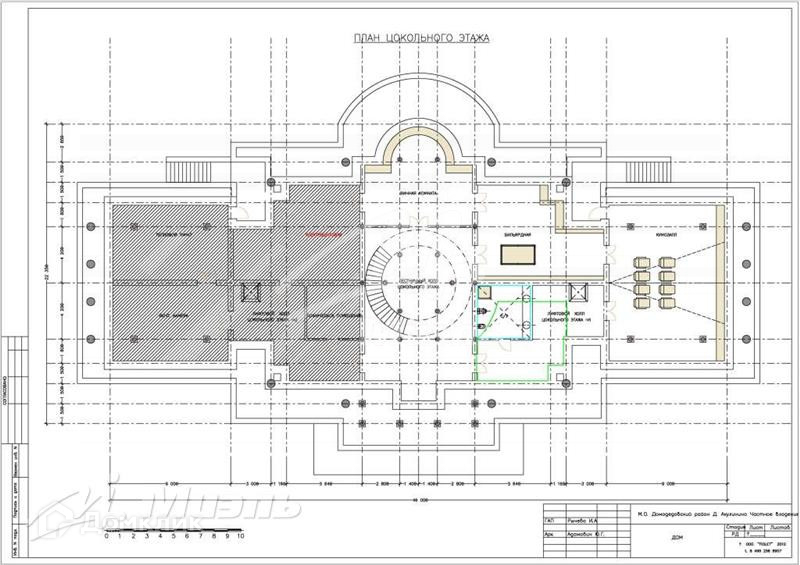 Цокольный этаж: холл с колоннами, две комнаты, две бани с душевыми с/у, бильярдная, домашний кинотеатр.