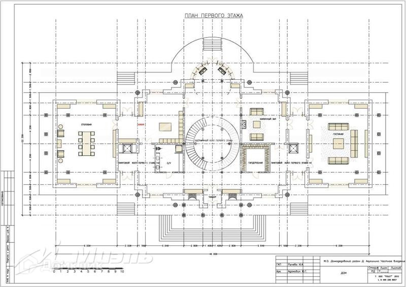 На 1-м этаже парадный вход и холл с колонами, парадной лестницей, зал для приема гостей 150 метров, кухня столовая, открытое патио, две комнаты.