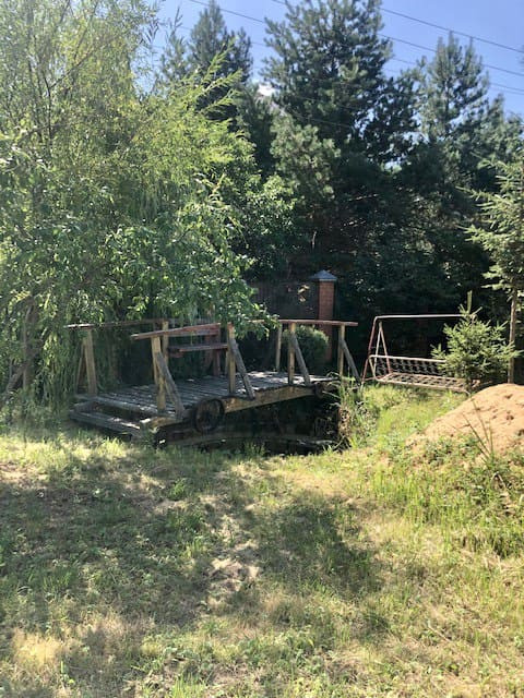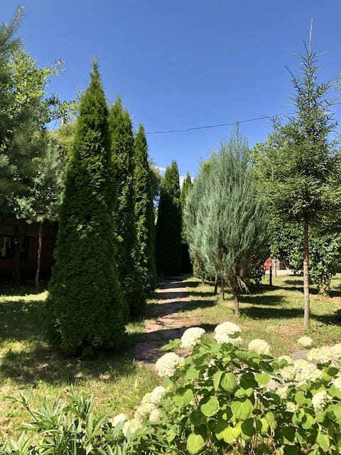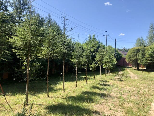 Пруд. Аллеи из экзотических деревьев. Много взрослых хвойных деревьев и берез, а также плодовых деревьев.