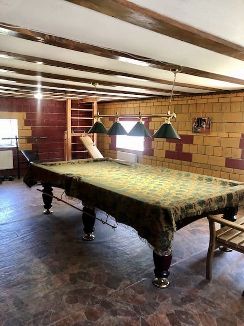 В доме 18 помещений, 4 из которых по 50 кв. м. (столовая, бильярдная, кинозал с камином и одна из спален) Бильярд (11 фут), спортзал с тренажерами.
