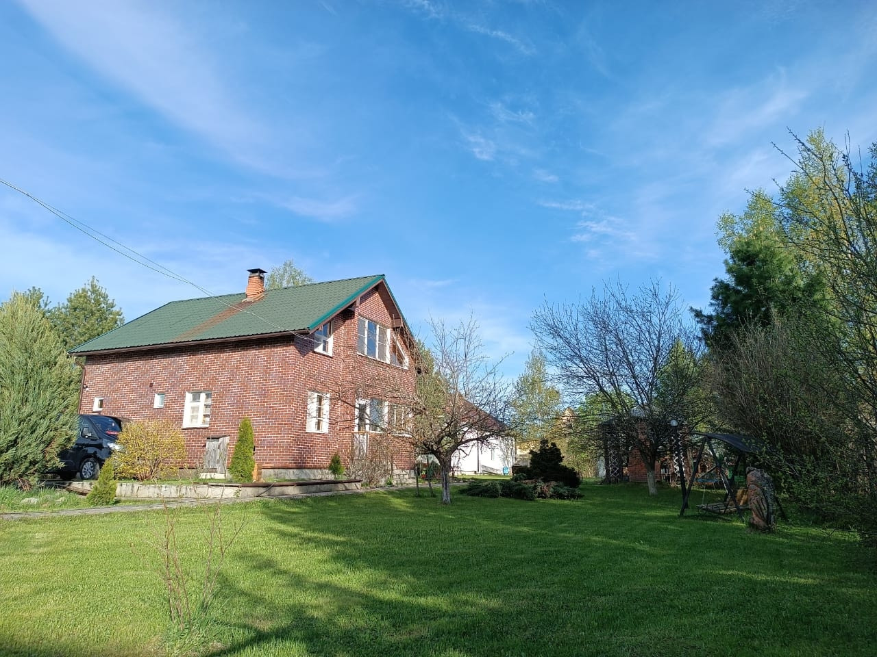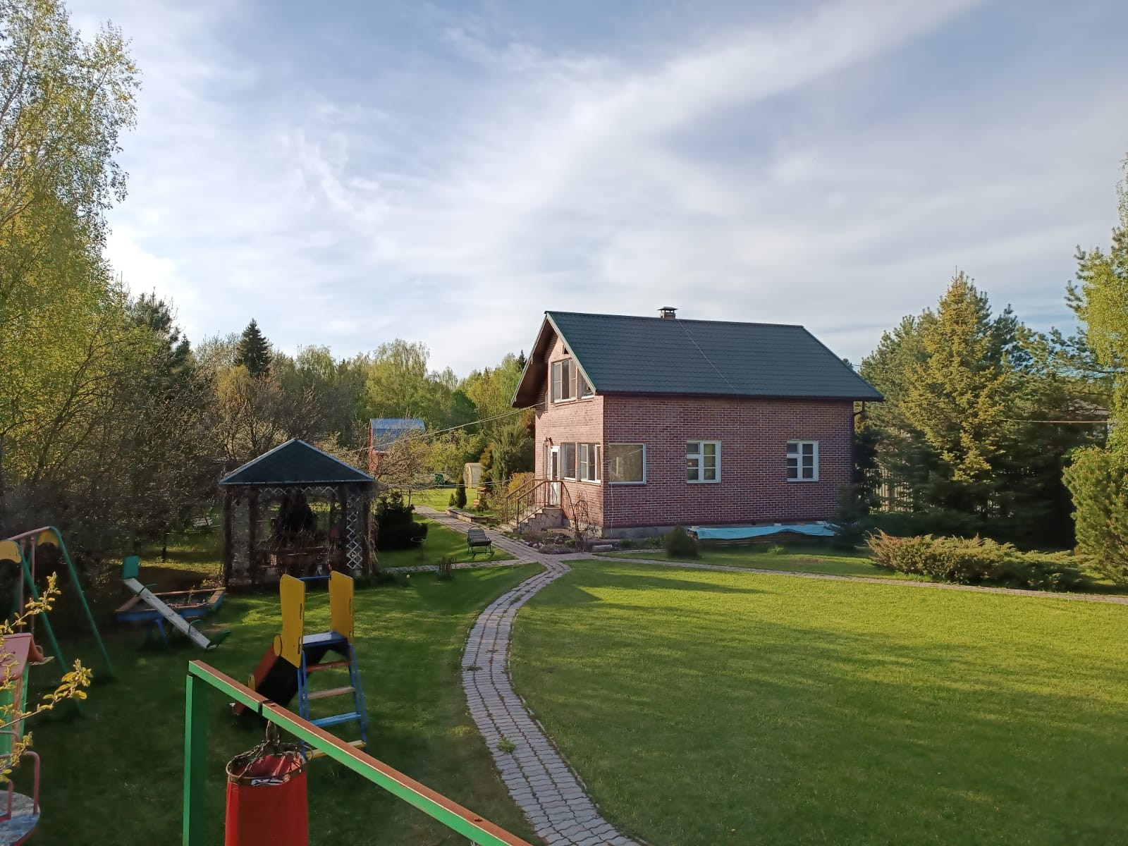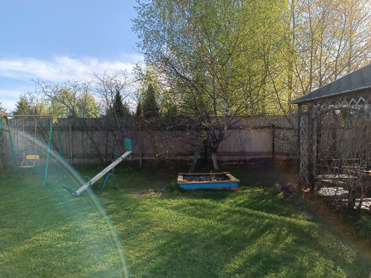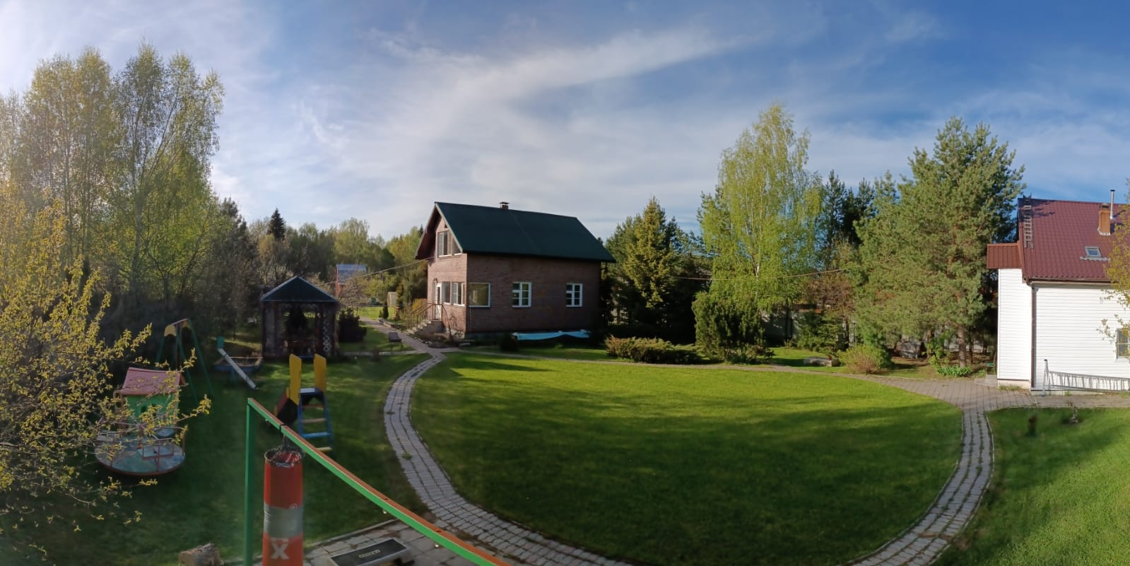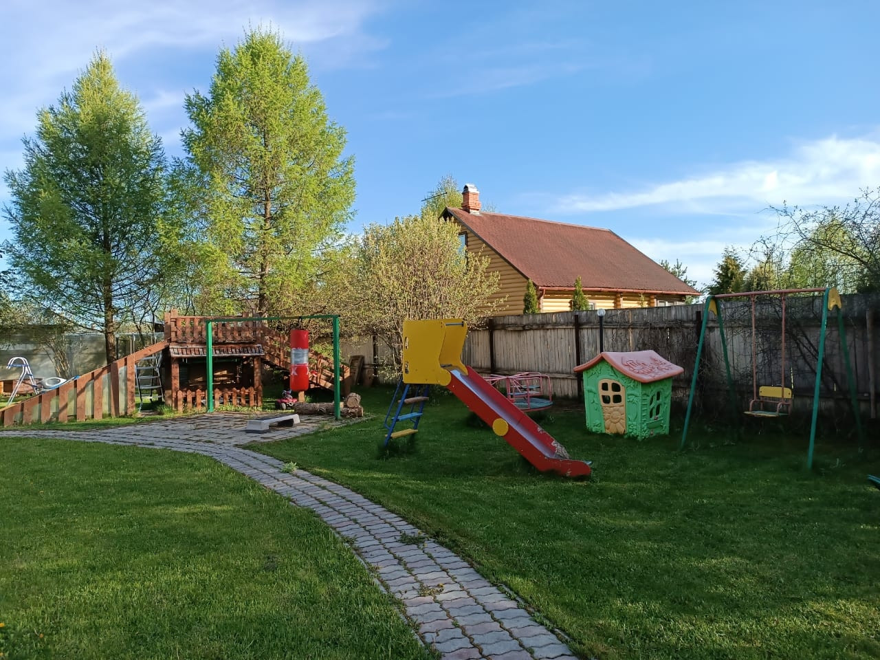 Игровая детская зона с детским городком. Три вида качелей, горка, песочница, детский домик, потайные места для игры в прятки.