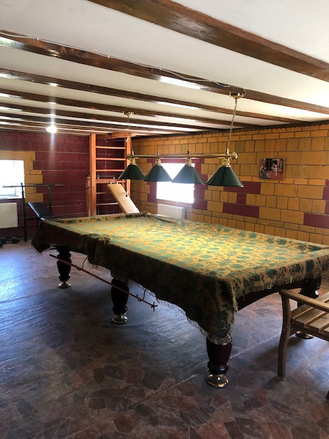 В доме 18 помещений, 4 из которых по 50 кв. м. (столовая, бильярдная, кинозал с камином и одна из спален) Бильярд (11 фут), спортзал с тренажерами.