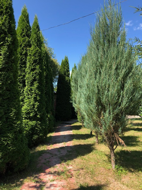 Пруд. Аллеи из экзотических деревьев. Много взрослых хвойных деревьев и берез, а также плодовых деревьев.