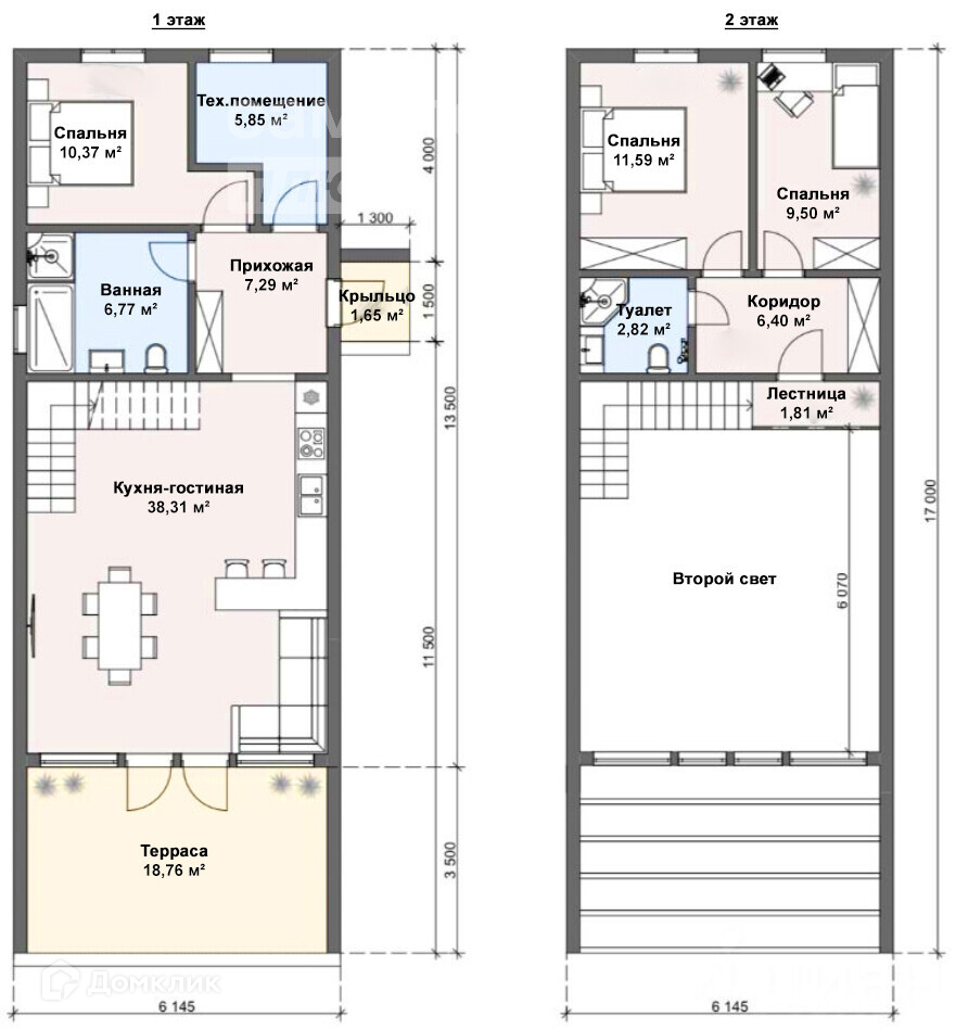 2 этаж: Две спальни по 12 и 10 кв.м., санузел на этаже.