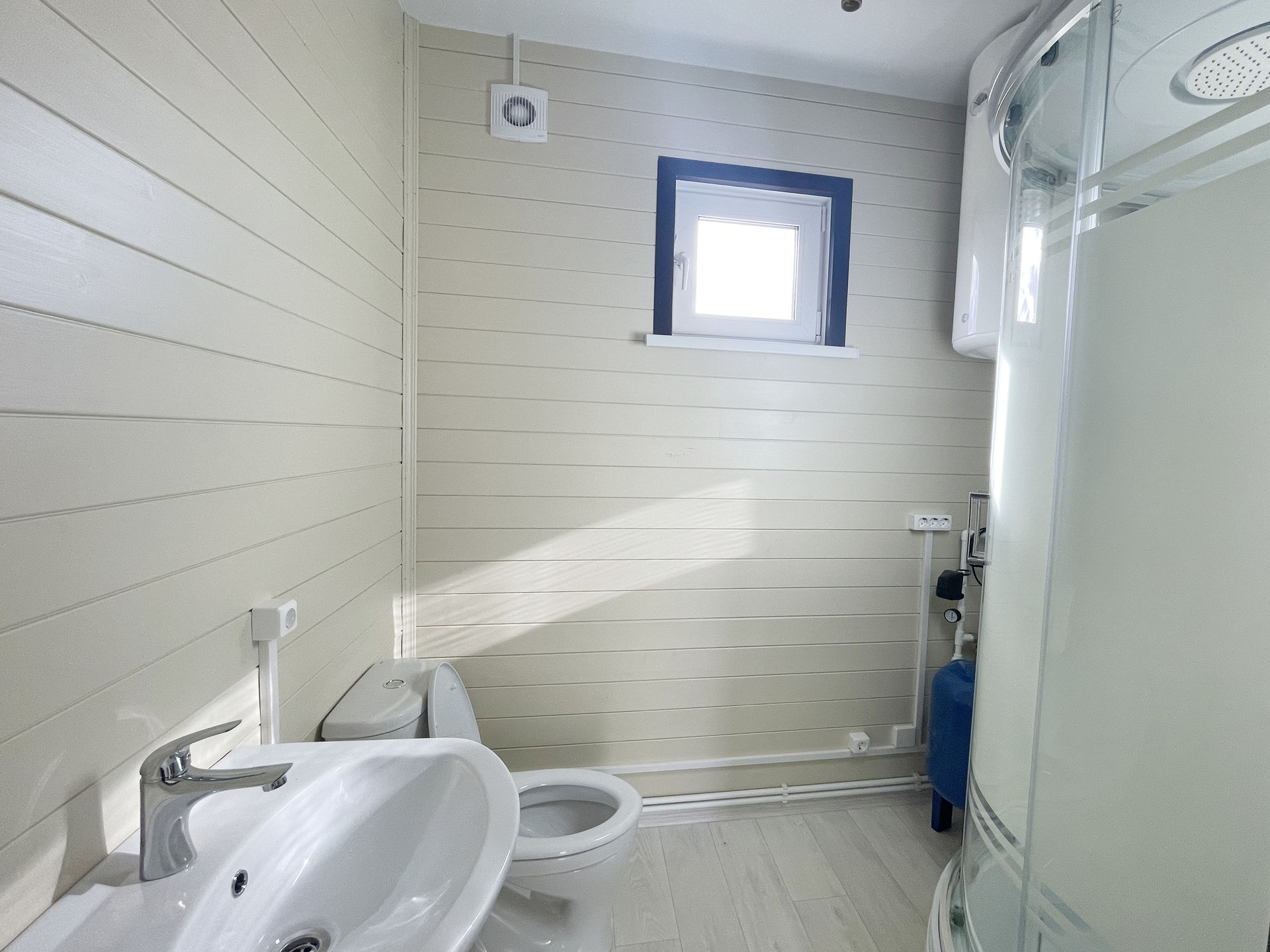 1-й этаж: 2 комнаты и вместительная кухня-гостиная и полностью оборудованный санузел (установлен бойлер, душевая кабина, унитаз, раковина).