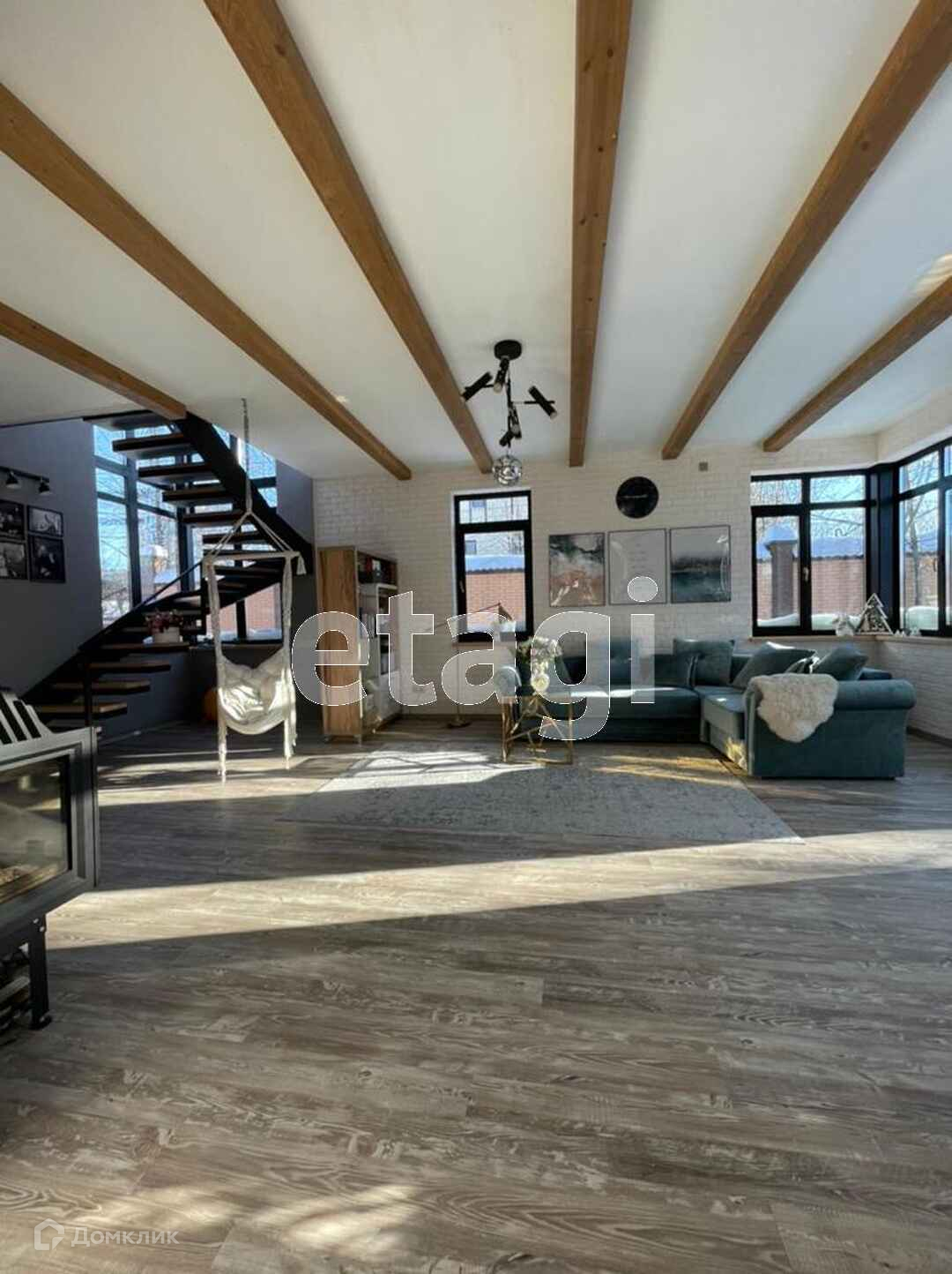 Лестница в доме по индивидуальному заказу с летящими ступенями. Витражное окно высотой 5,5 м делает дом очень светлым. Стильная трехсторонняя Каминная топка Kratki - огонь видно с трех сторон, выдает тепла 18кВТ, при желании можно отопить весь дом. Весь первый этаж и часть второго - теплые полы. Дом очень теплый. Потребление энергии невысокое. Водоснабжение центральное, стоит полная система водоочистки на весь дом Water Boss. Можно пить из крана.