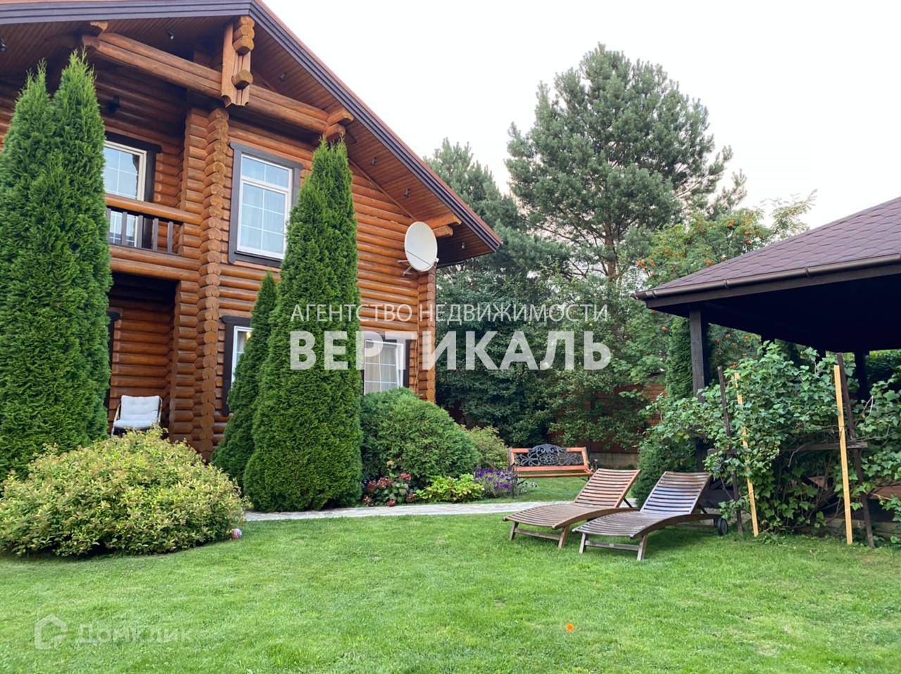 Участок облагорожен, хвойные деревья, тропинки выложены плиткой, высажен по участку газон, просторная беседка.
