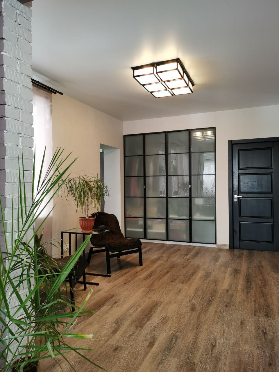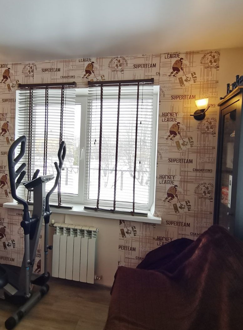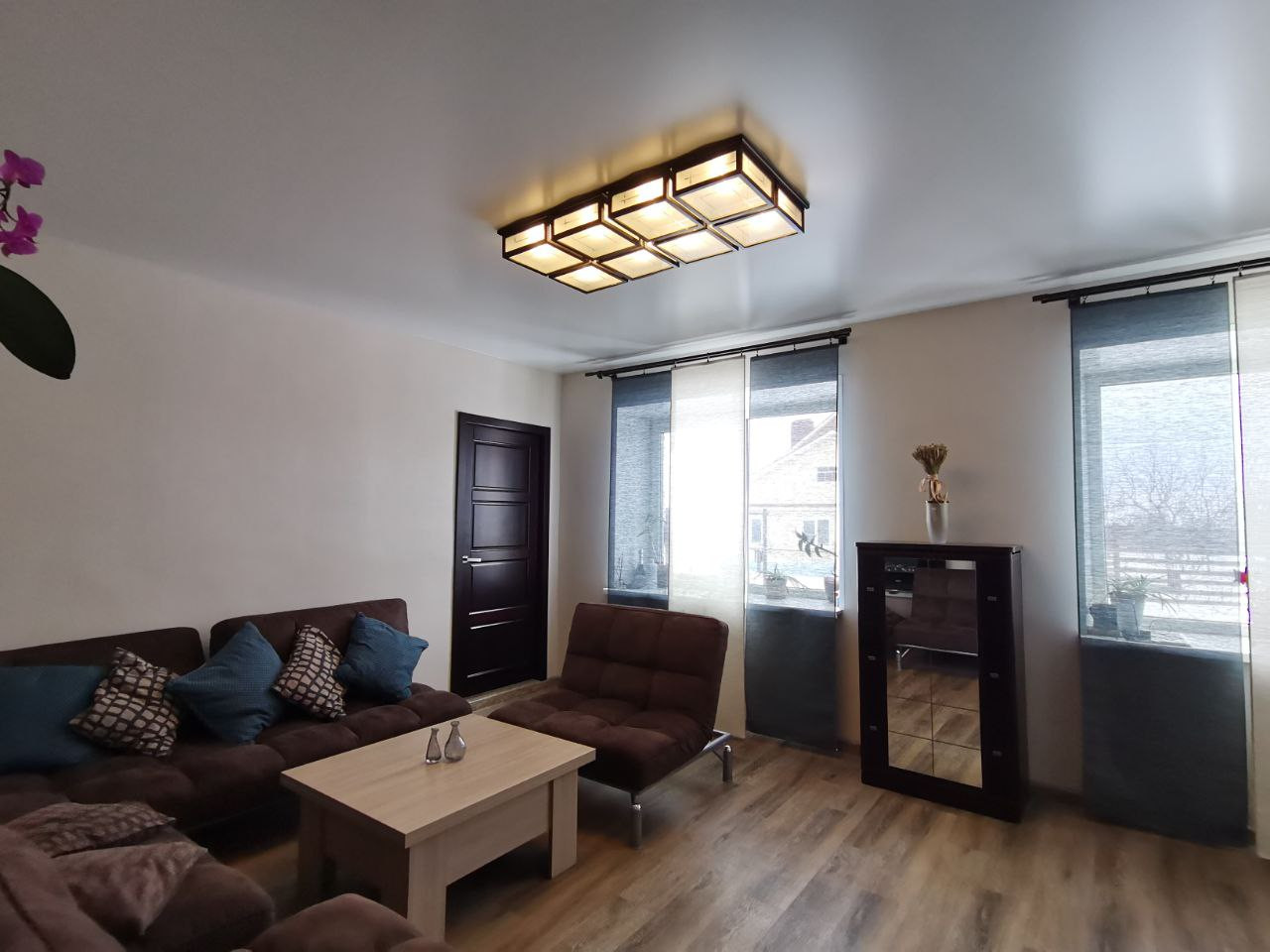 Двери все в едином стиле, натуральное дерево, окна пластиковые,