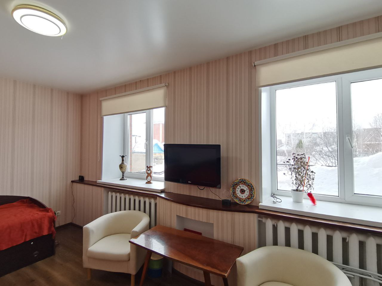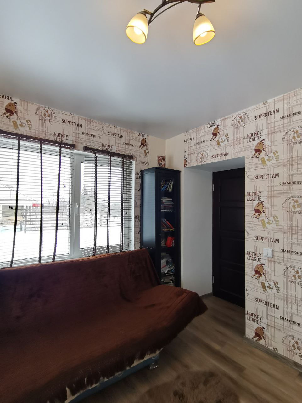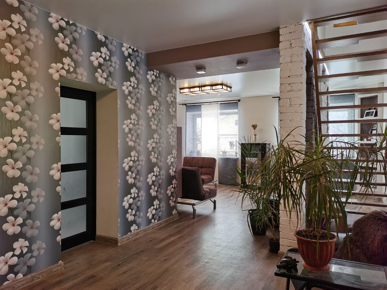 Двери все в едином стиле, натуральное дерево, окна пластиковые,