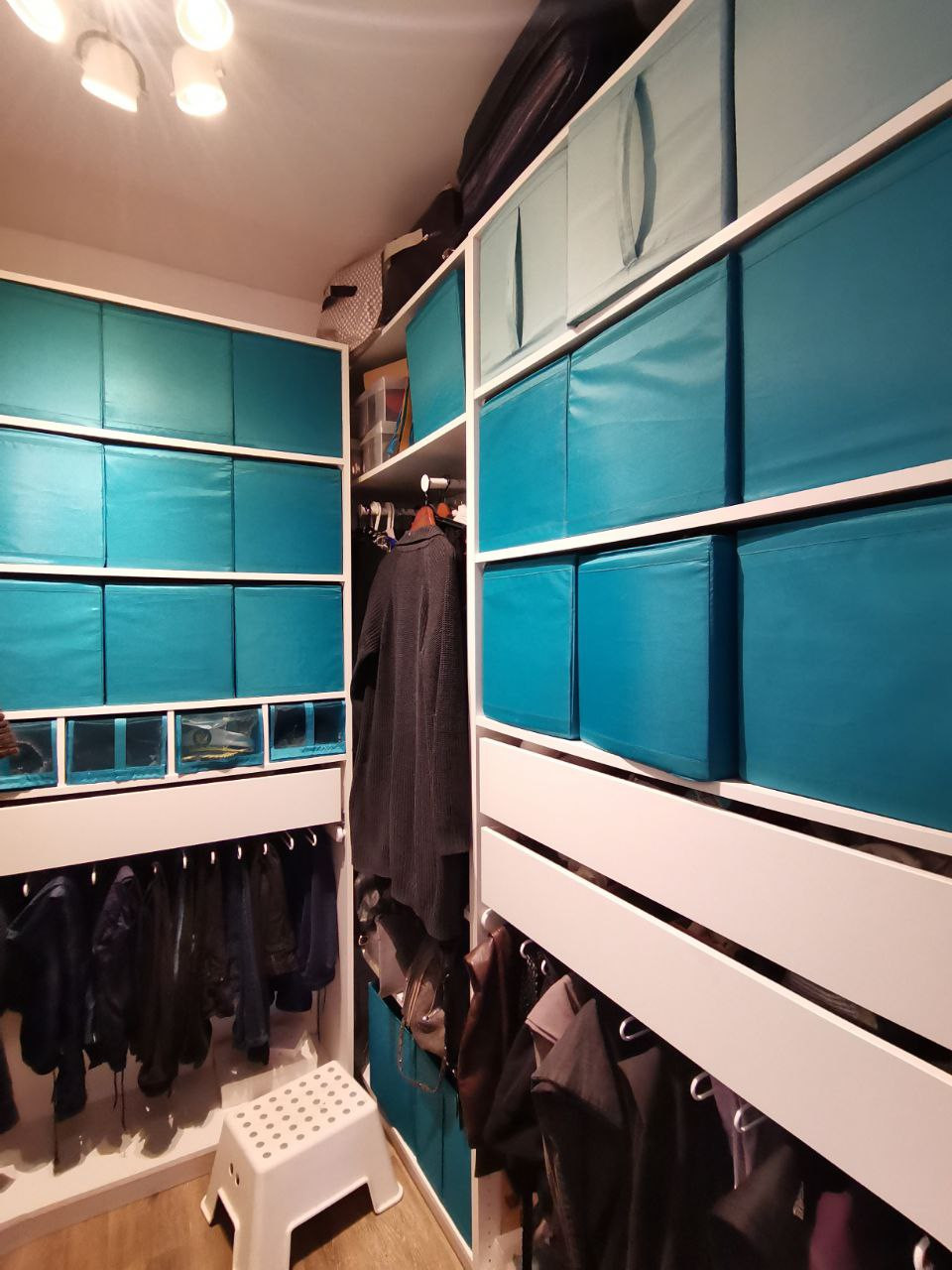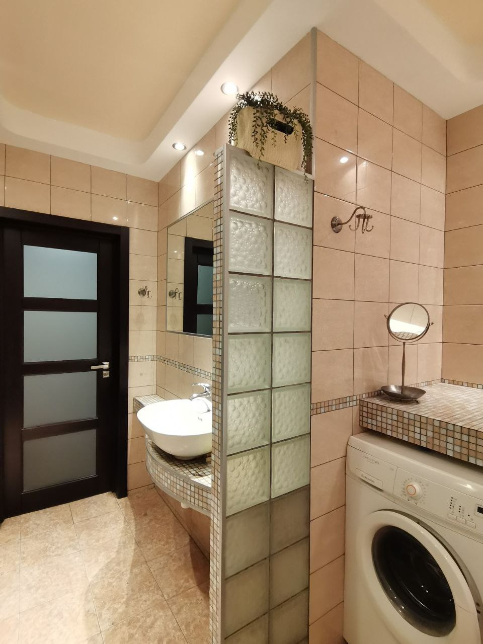 В ванной оборудованная система хранения с комплектом для сушки, хранения и глажения белья.