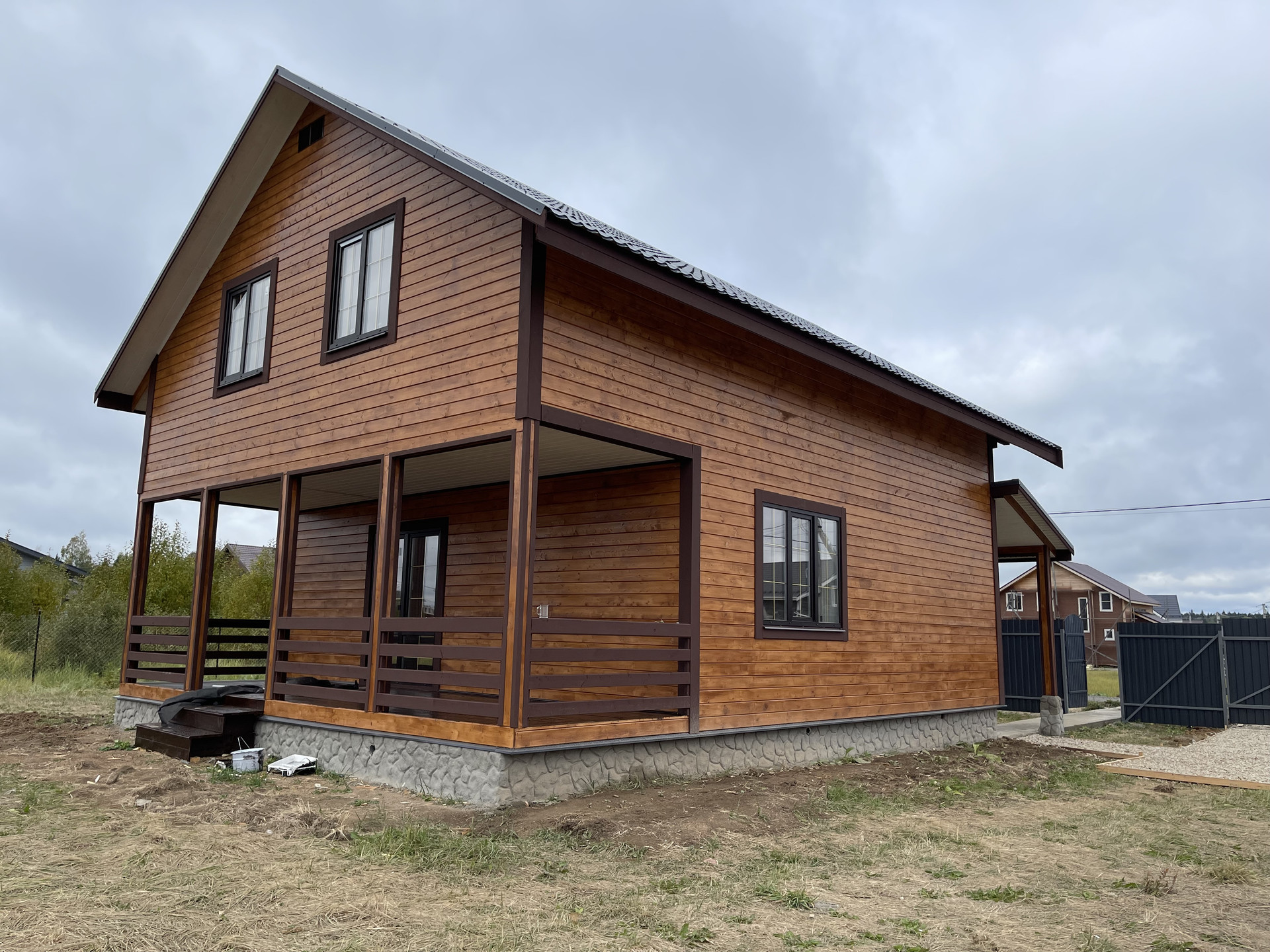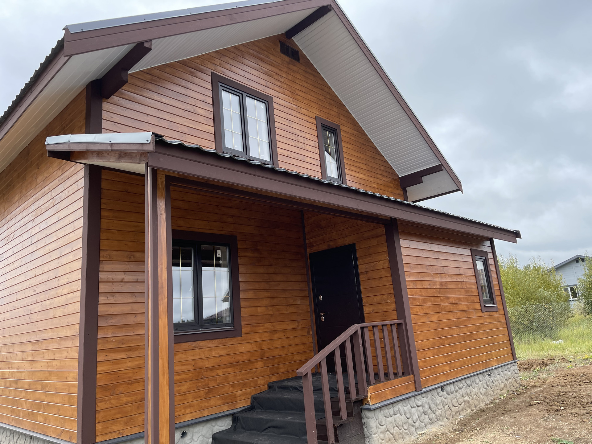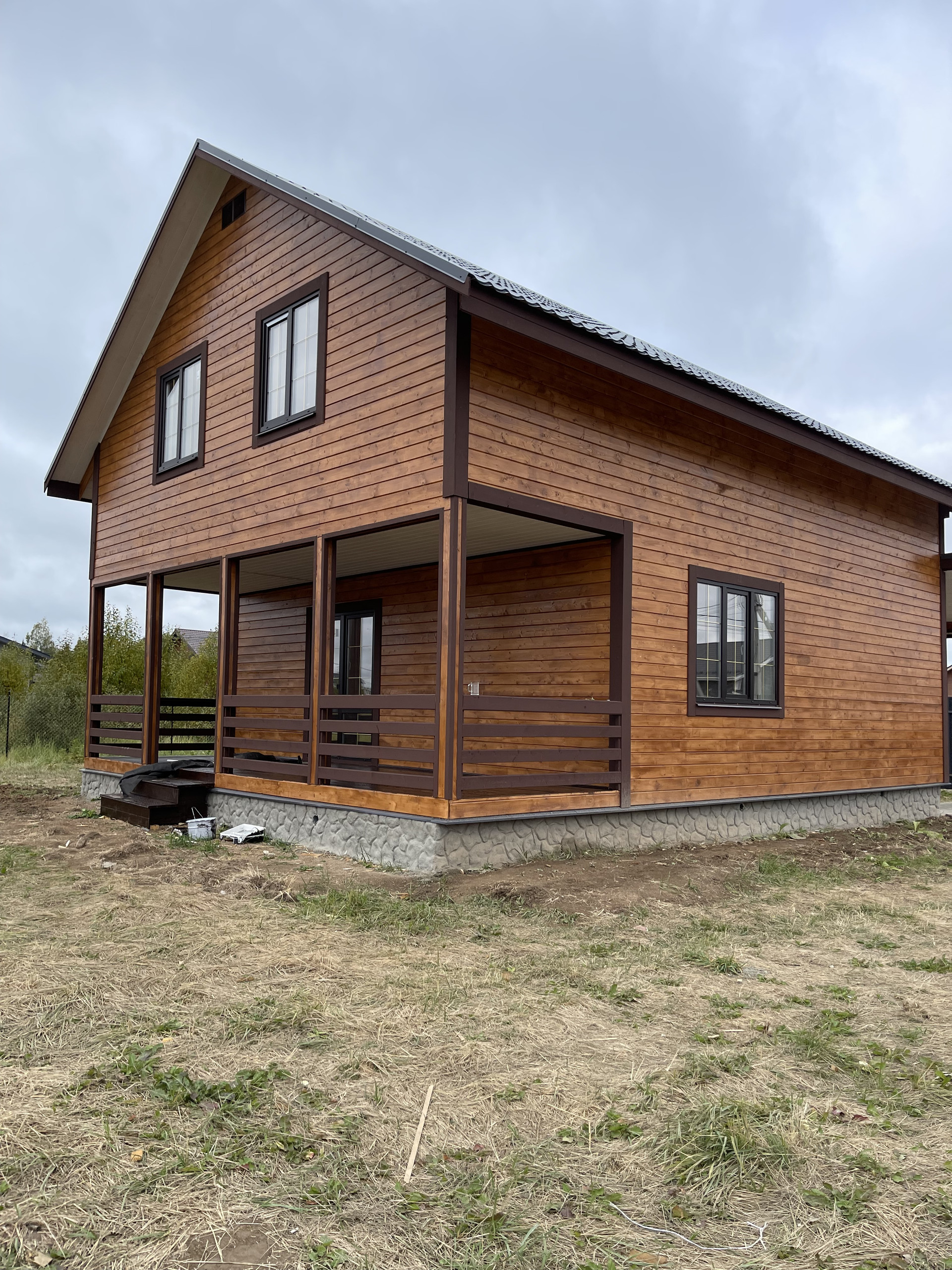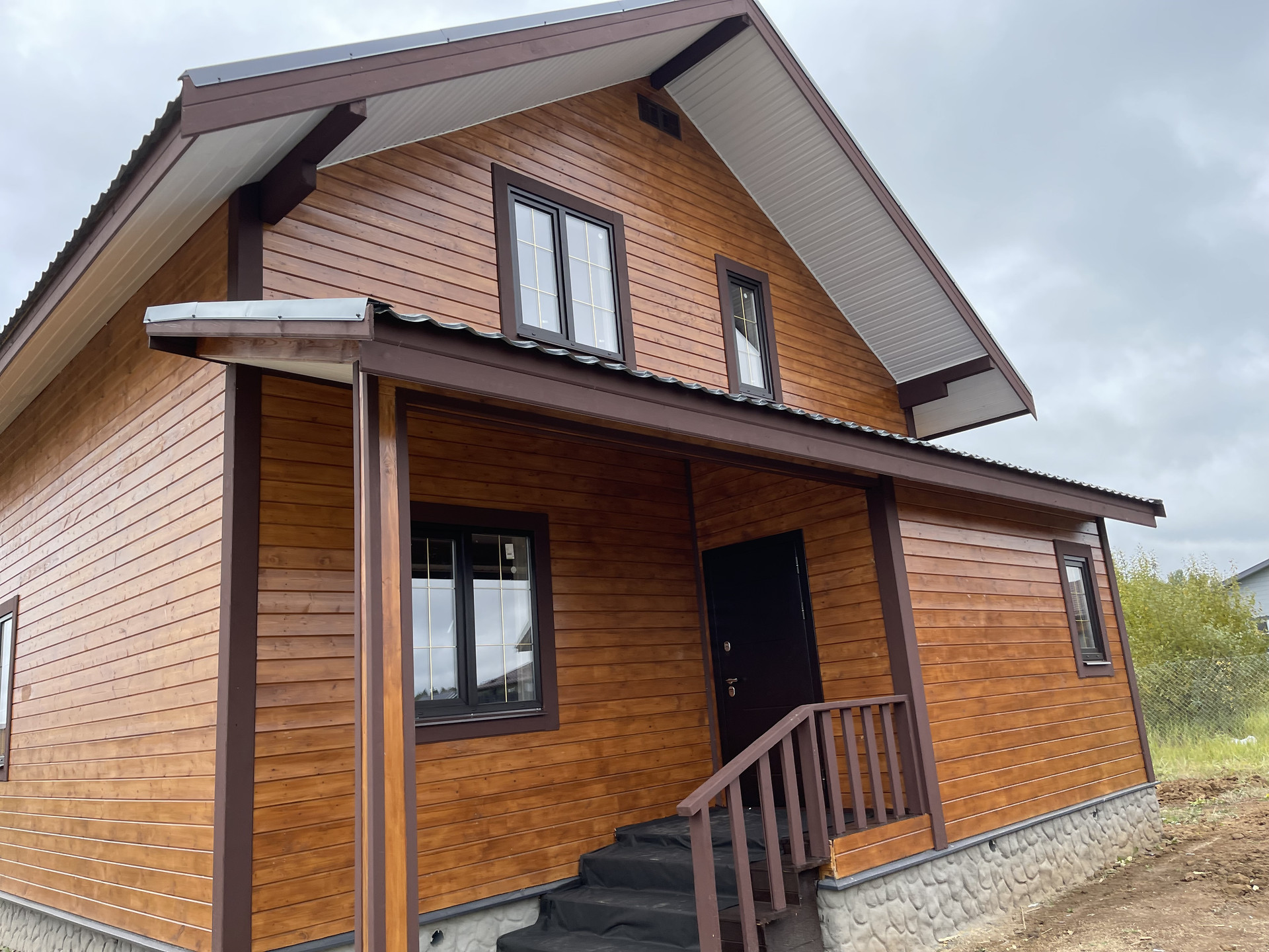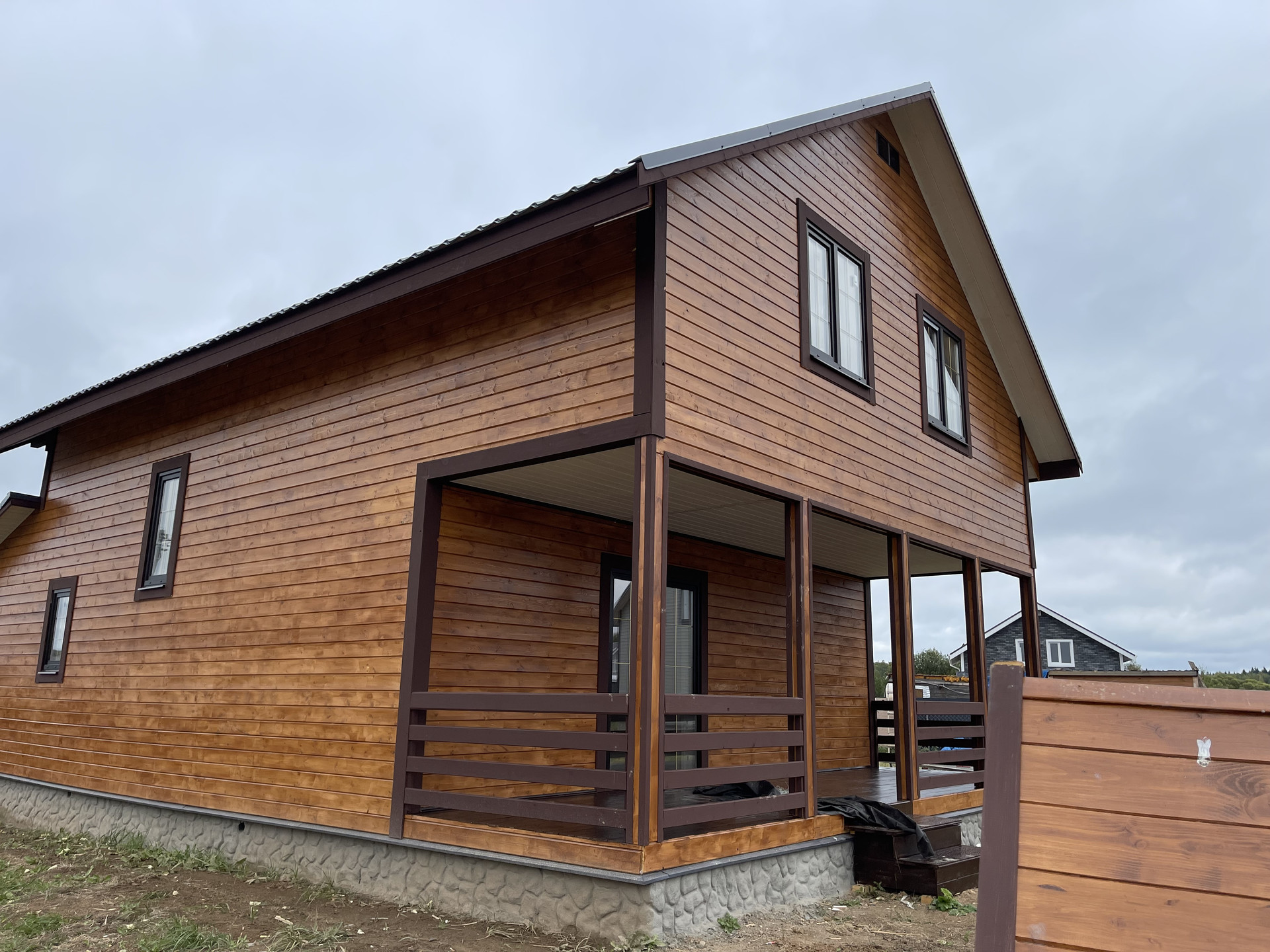 Дом с террасой 180 м кв. из бруса 150 мм оба этажа , утеплен 10 см , внутри обшит имитацией бруса, ленточный фундамент (1,5 метр в глубину ), кровля - металл черепица, пластиковые стеклопакеты поворотно откидные три стекла , полы - ламинат. Входная дверь металлическая, хороши межкомнатные двери. На доме установлены снего за держатели и водоотливы.