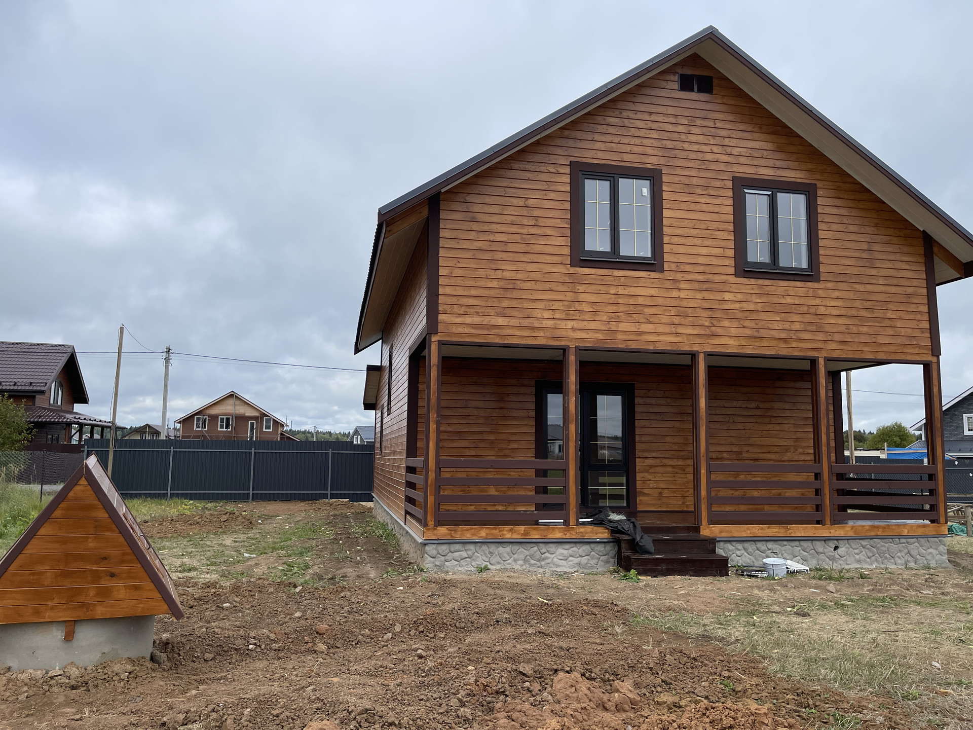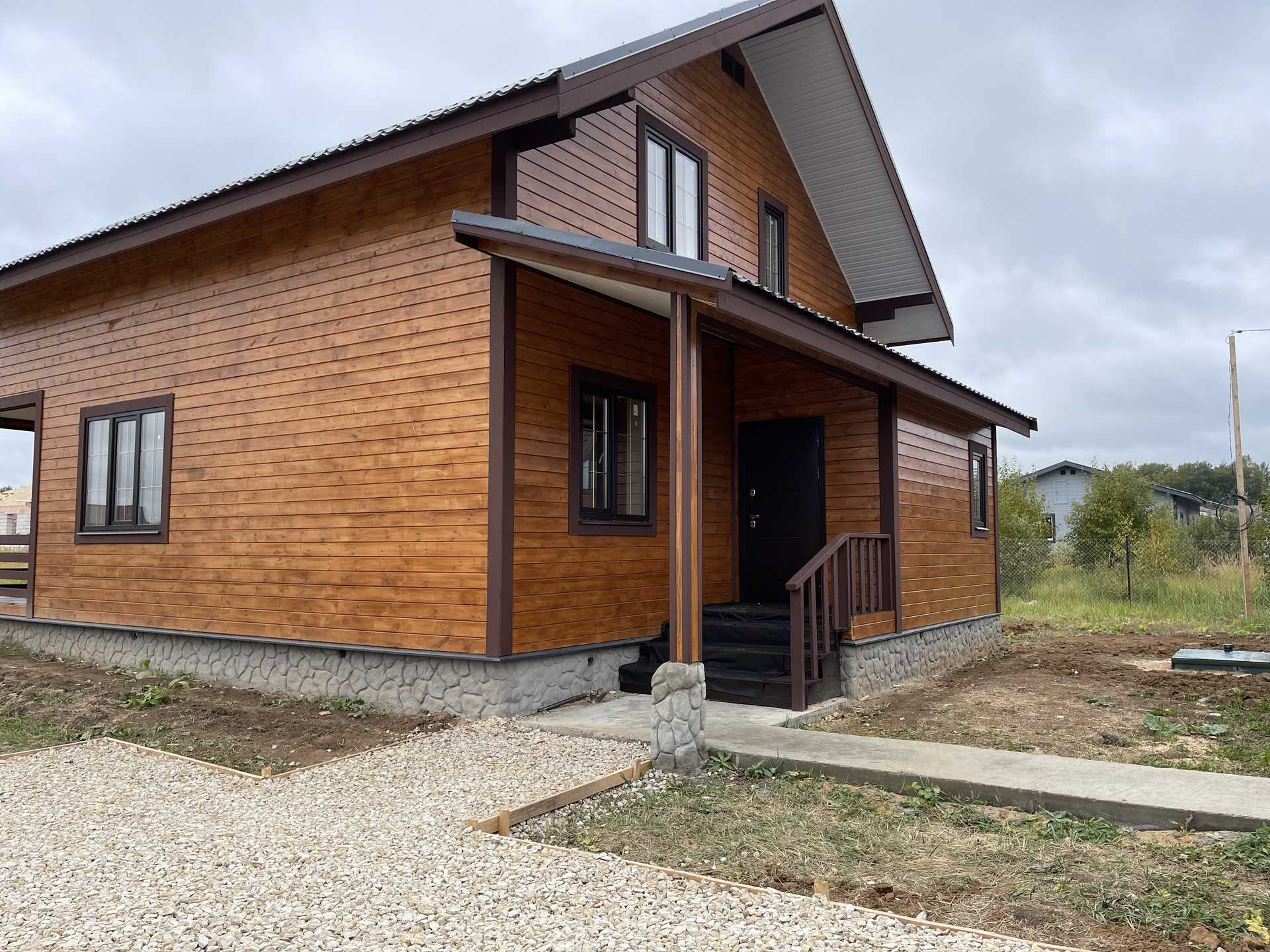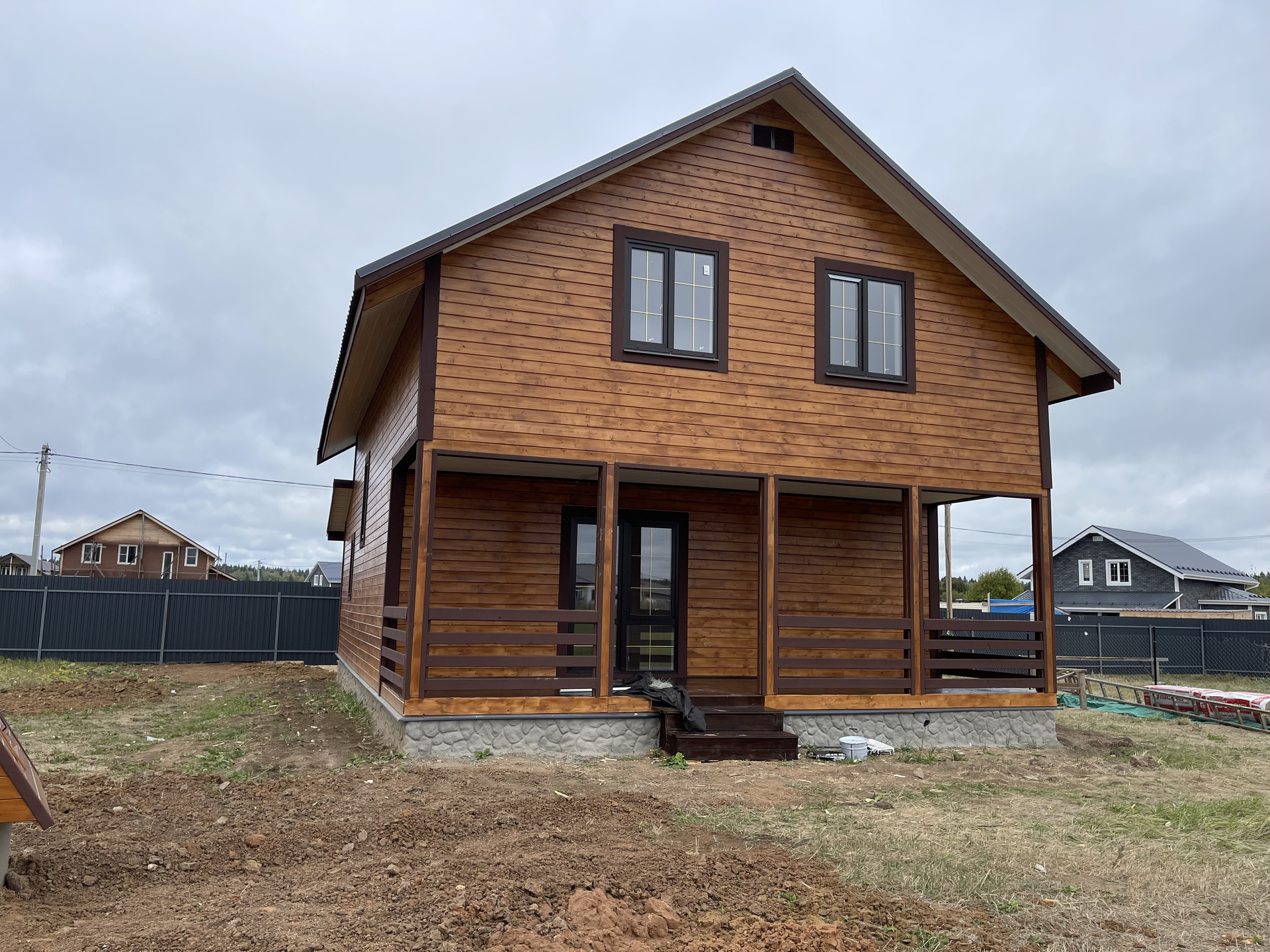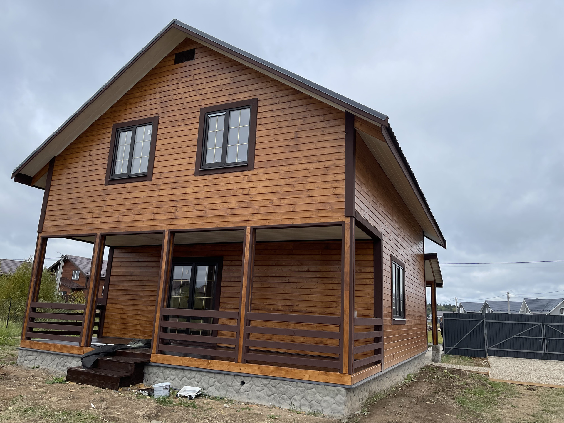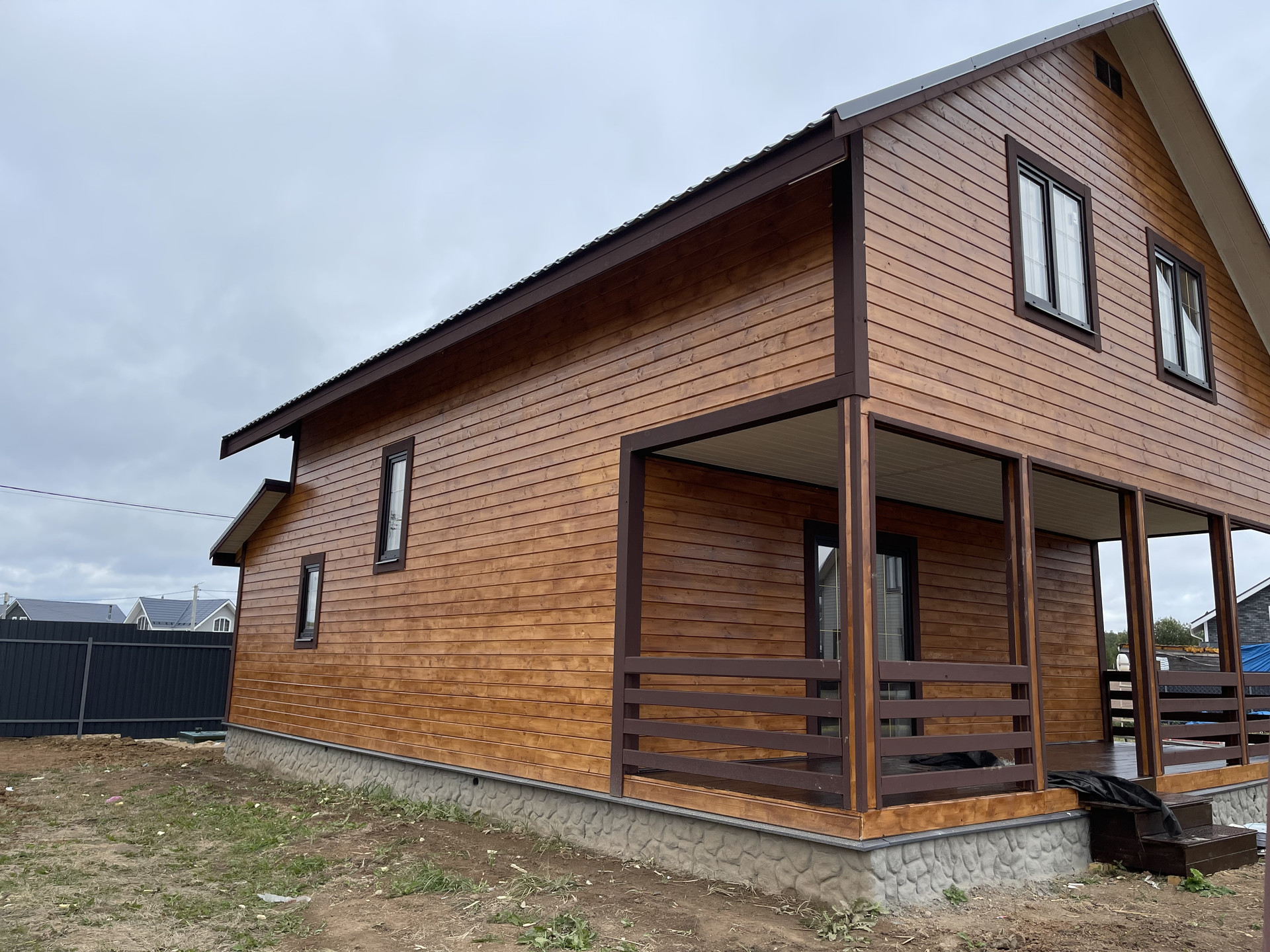 Дом с террасой 180 м кв. из бруса 150 мм оба этажа , утеплен 10 см , внутри обшит имитацией бруса, ленточный фундамент (1,5 метр в глубину ), кровля - металл черепица, пластиковые стеклопакеты поворотно откидные три стекла , полы - ламинат. Входная дверь металлическая, хороши межкомнатные двери. На доме установлены снего за держатели и водоотливы.