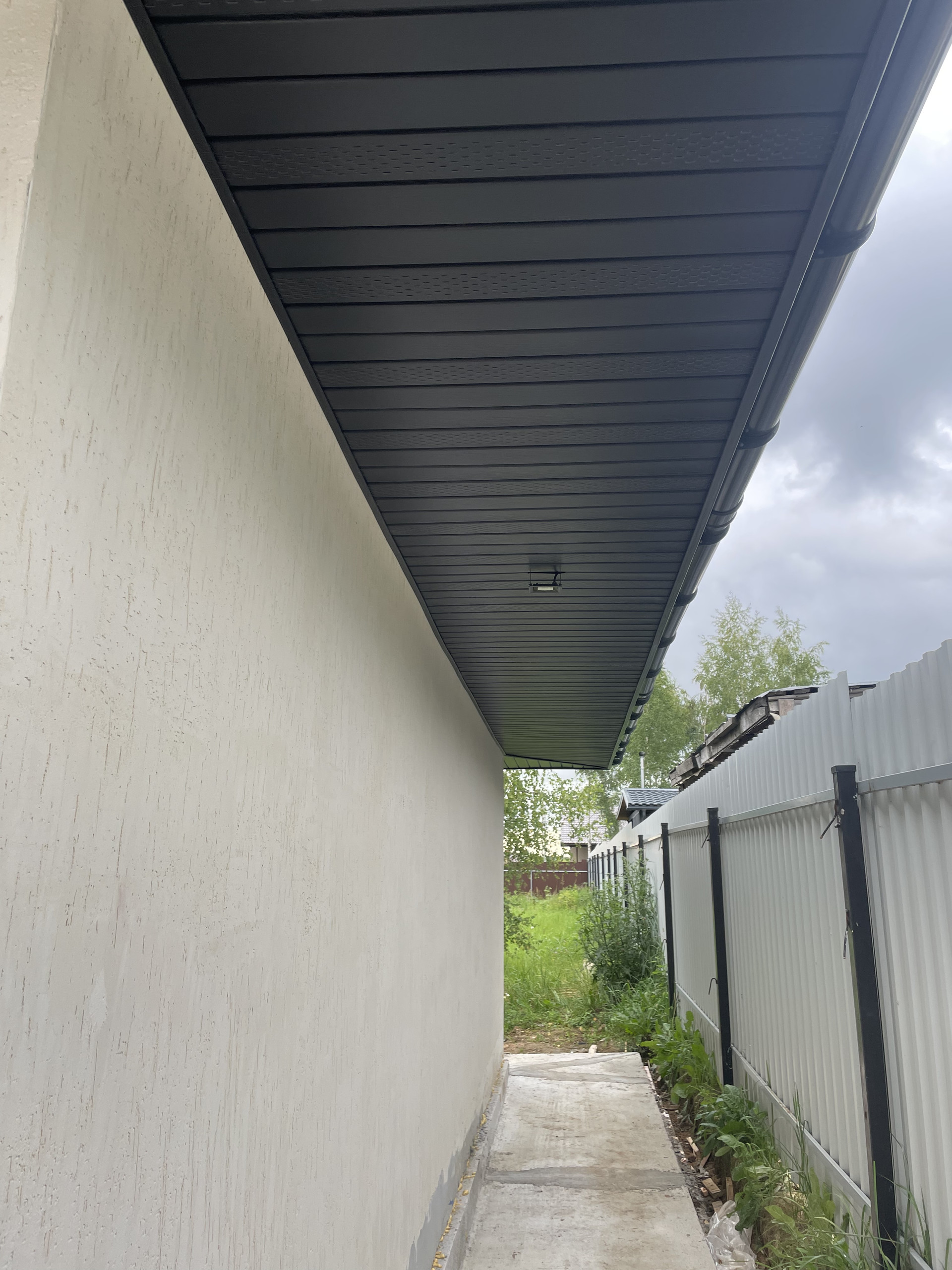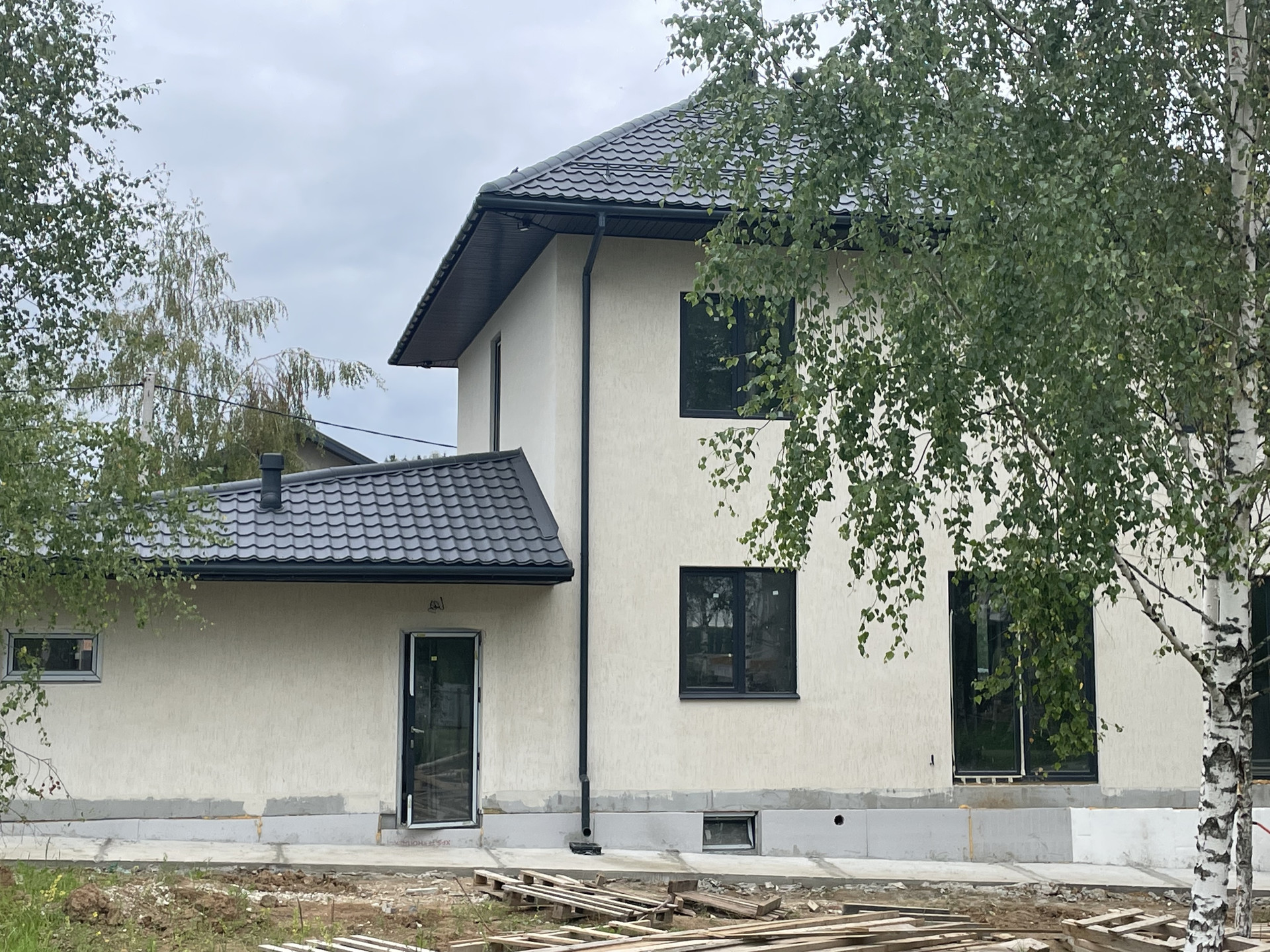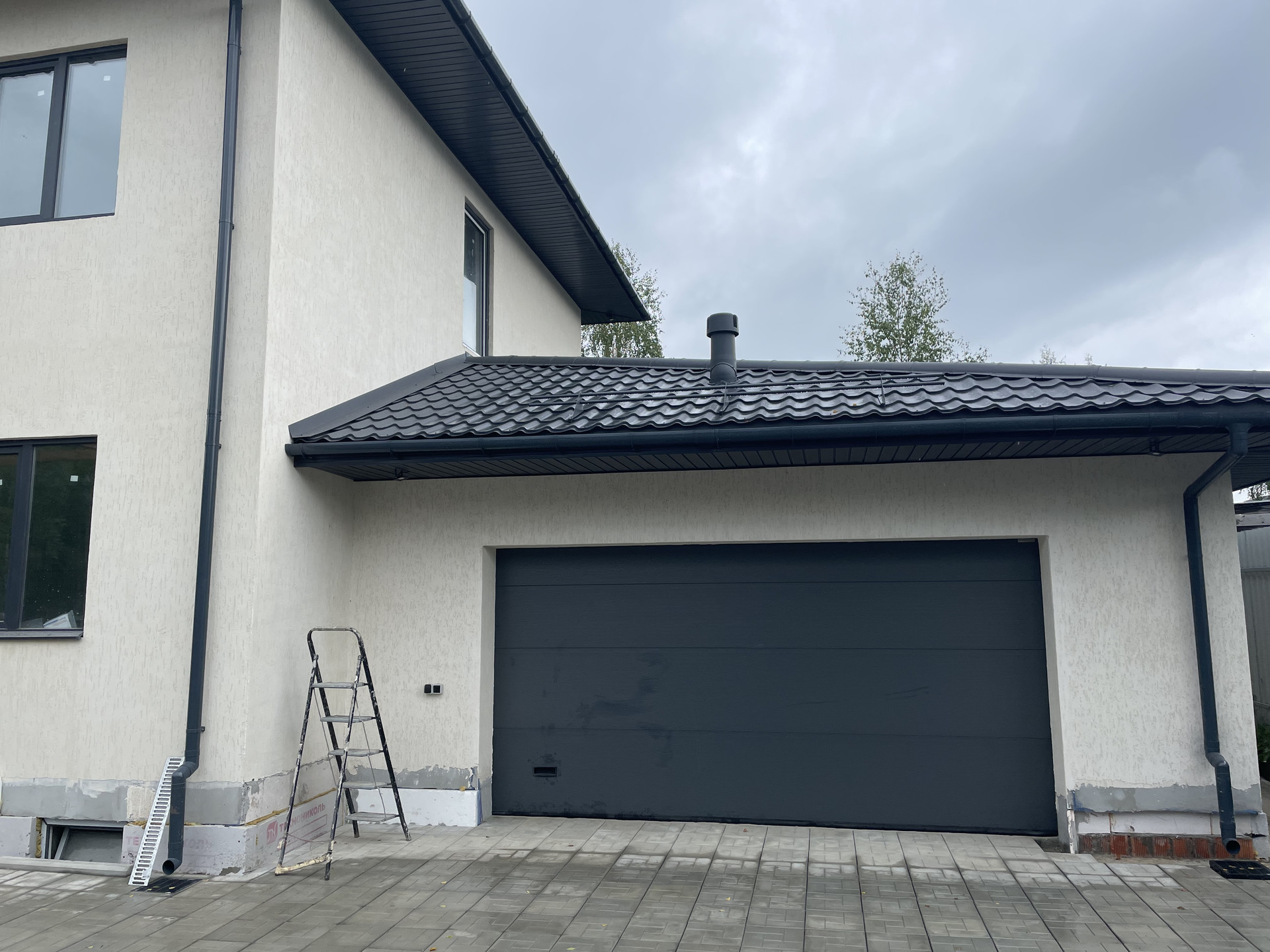 Материал стен - газосиликатные блоки фирмы Bonolit. Крыша металлочерепица 0,5 мм, матовая с покрытием - пурал - фирма Grand line. Окна под цвет крыши - графит - фирма Rehau. Автоматика ворот гаража фирма - Alutech.